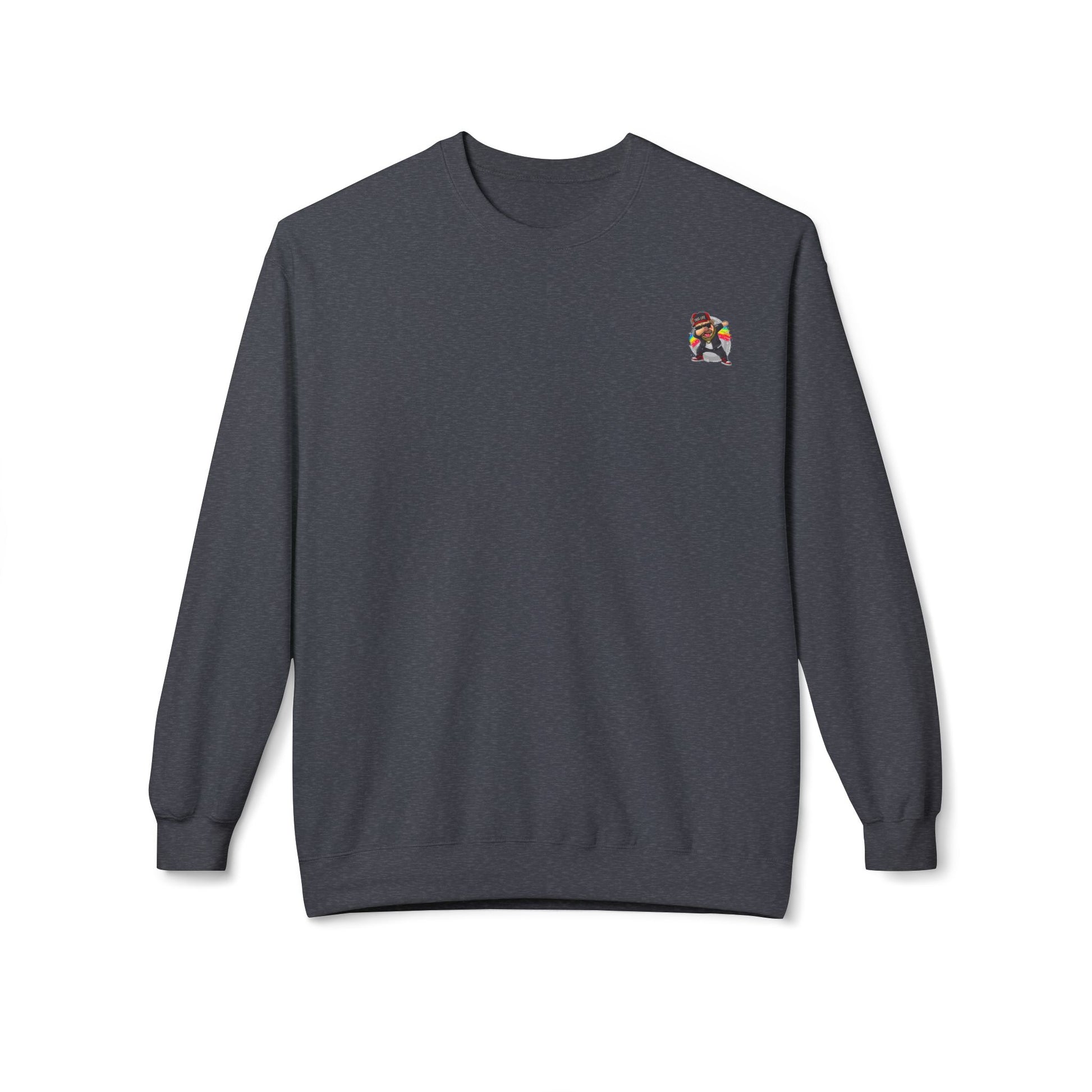 This sweater features a subtle small pug emblem on the left chest for a clean everyday look