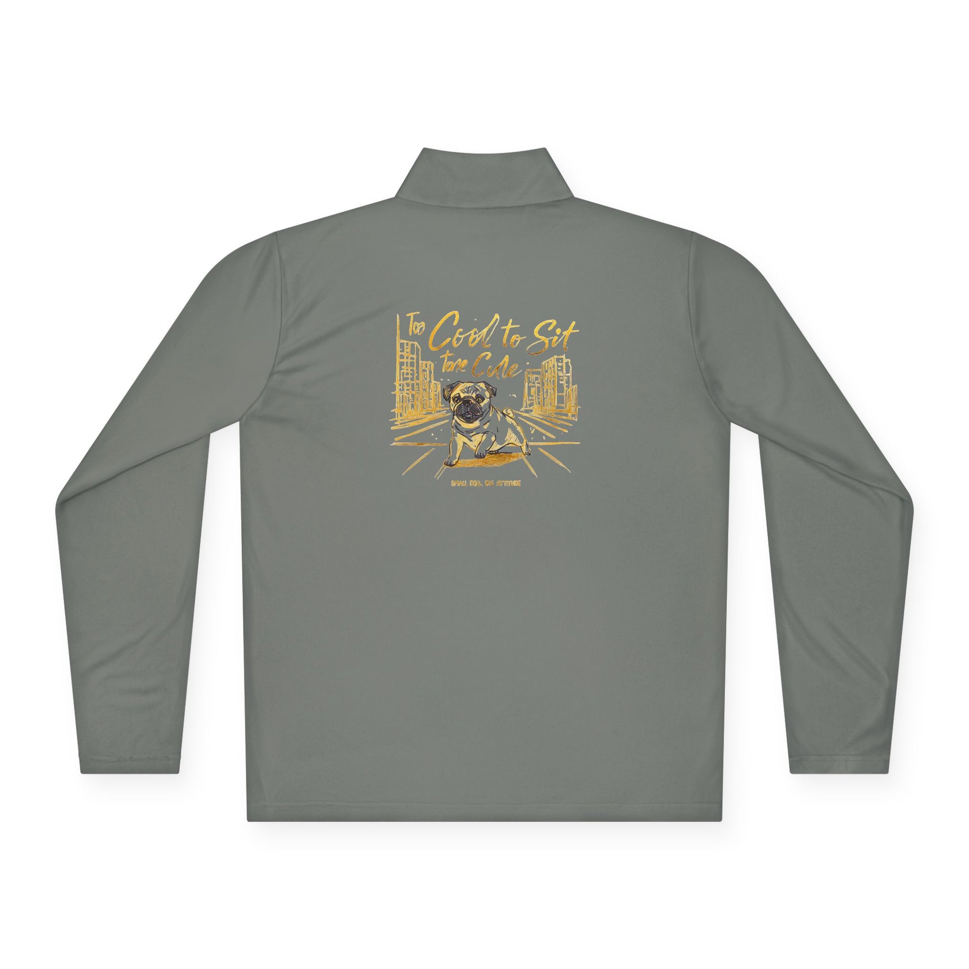 This quarter-zip pullover features a small embroidered-style pug icon on the left chest and a detailed illustrated back graphic