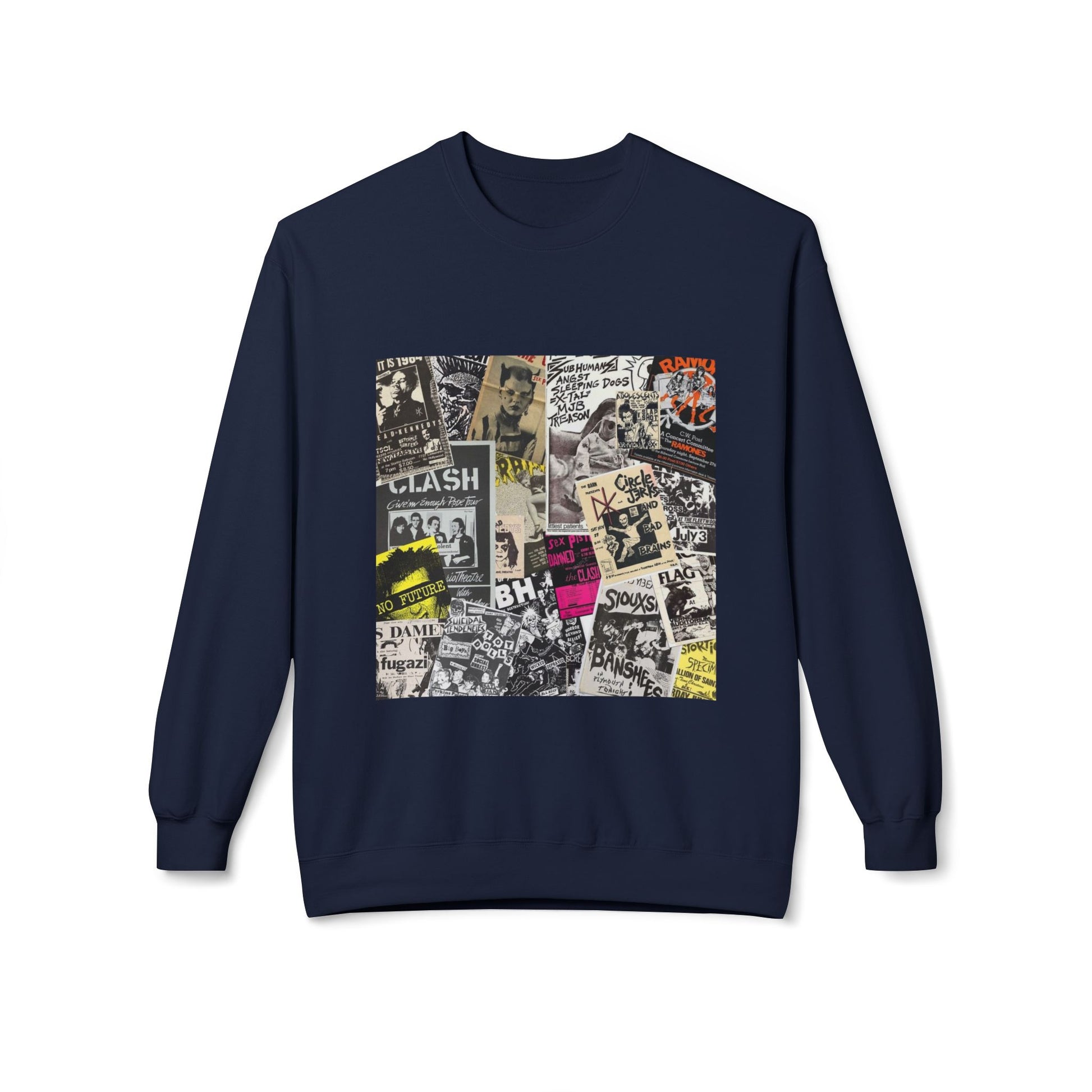 This sweatshirt features the same powerful punk collage graphic printed on the front