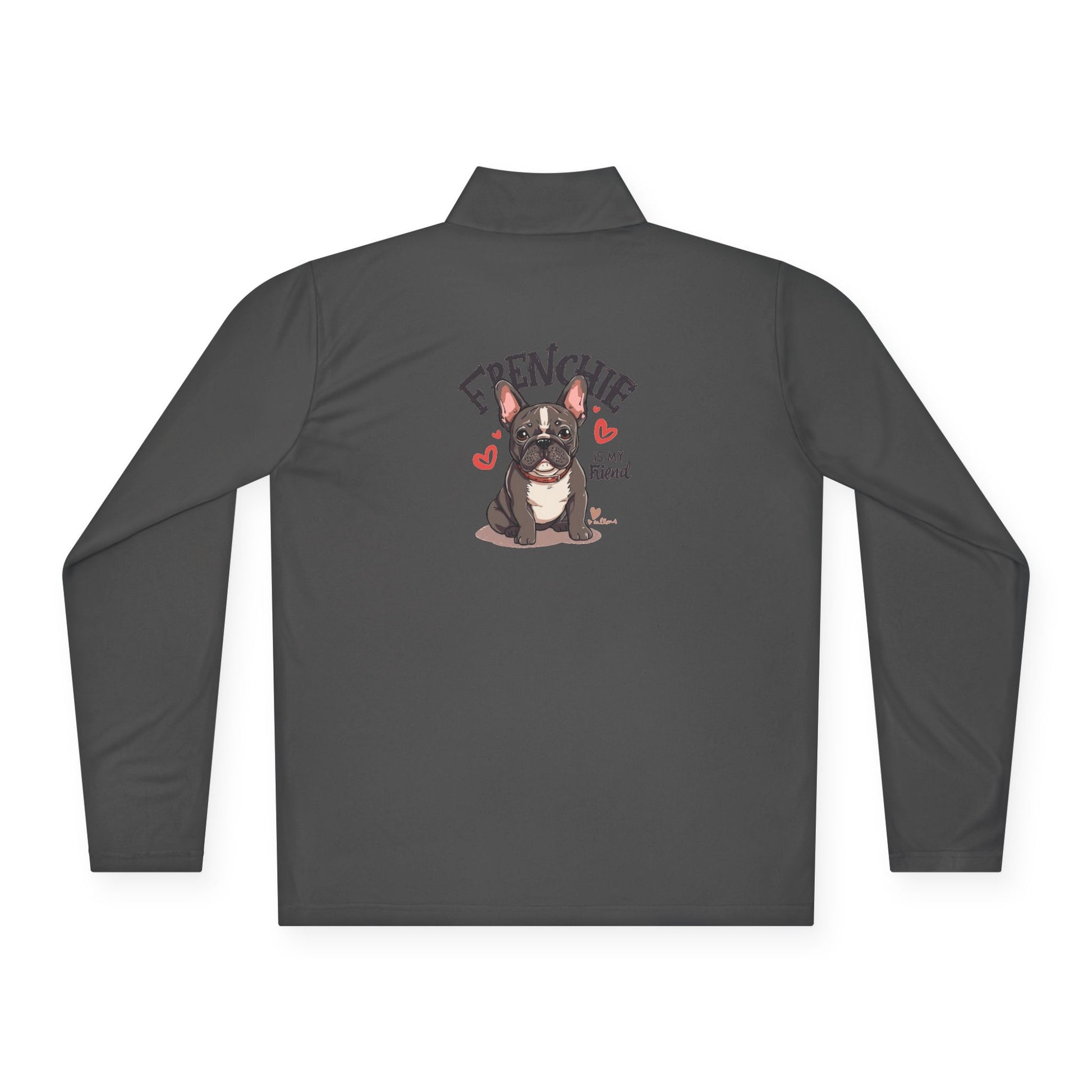 This quarter zip pullover features a minimal front chest French Bulldog detail and a warm illustrated Frenchie artwork on the back