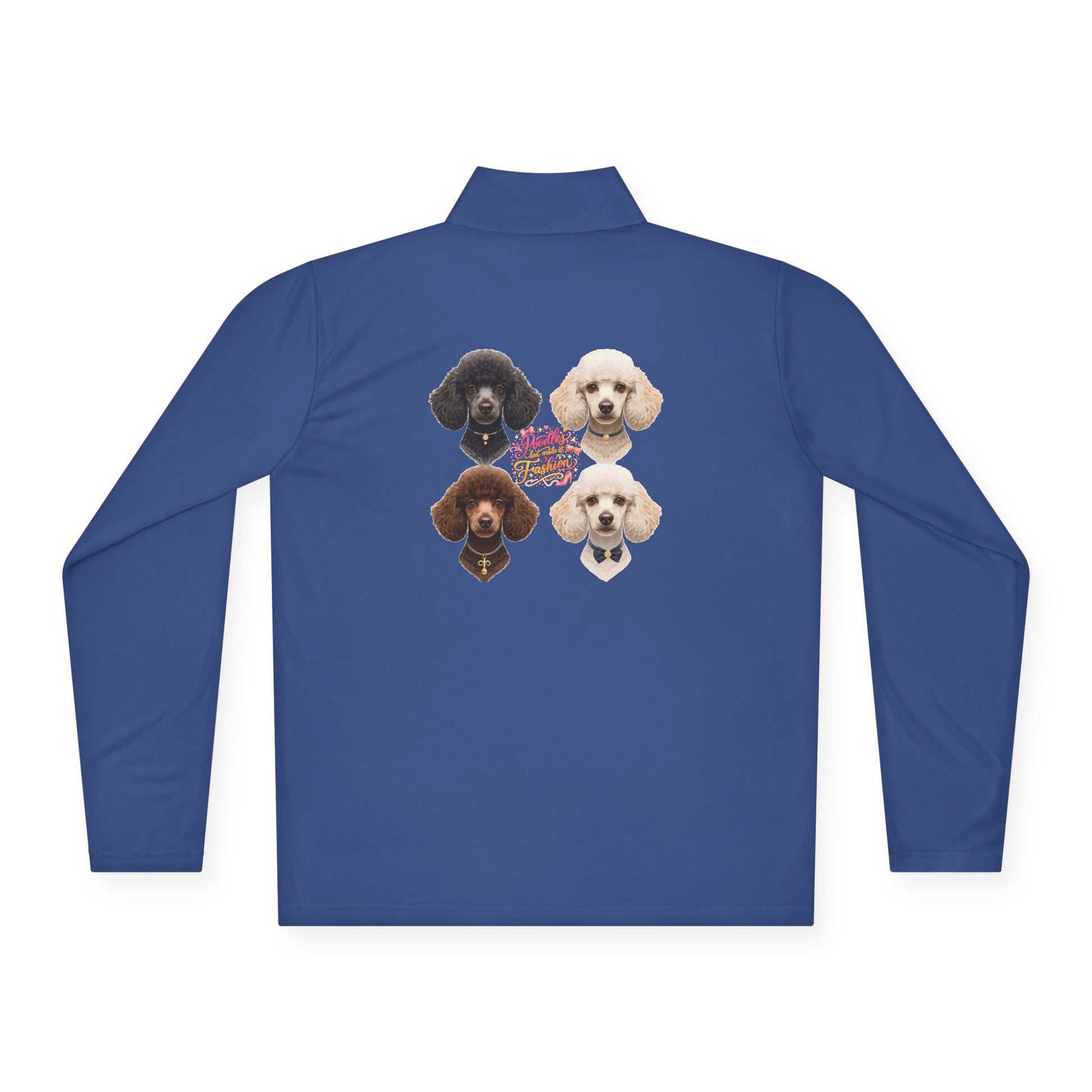 This quarter-zip pullover features a small embroidered-style poodle emblem on the left chest and a full-back graphic showcasing four elegant poodles with the statement “Poodles But Make It Fashion”