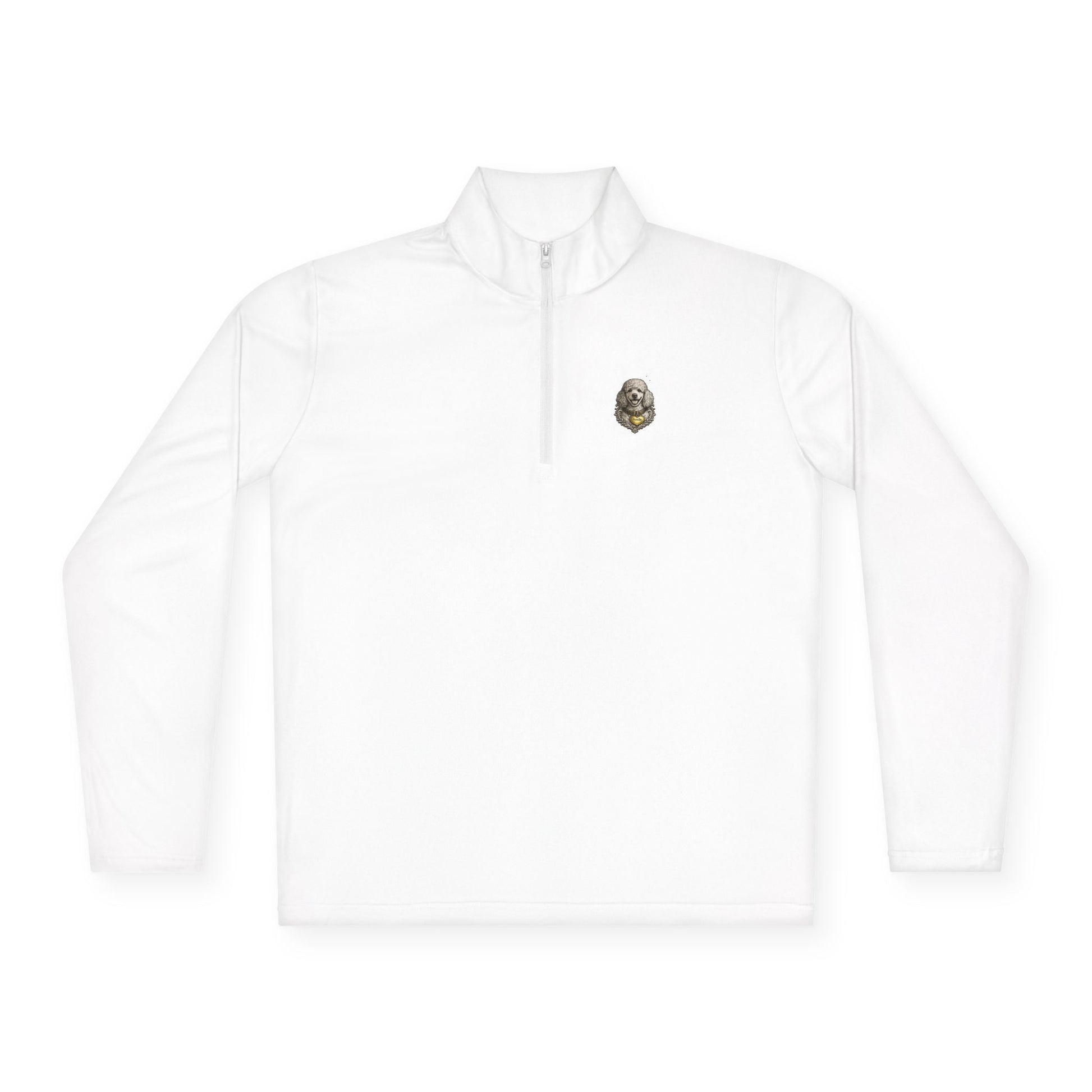 This zip-up features the same poodle ink illustration printed only on the front chest area, offering a subtle and elevated aesthetic.