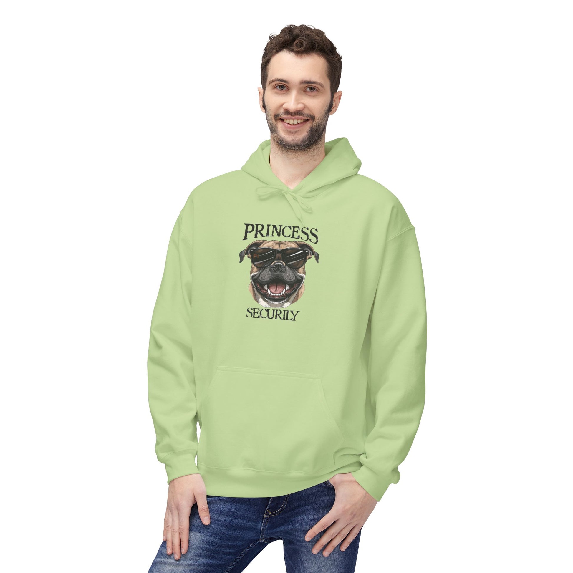 This graphic hoodie features a confident bulldog illustration with the playful “Princess Security” slogan.