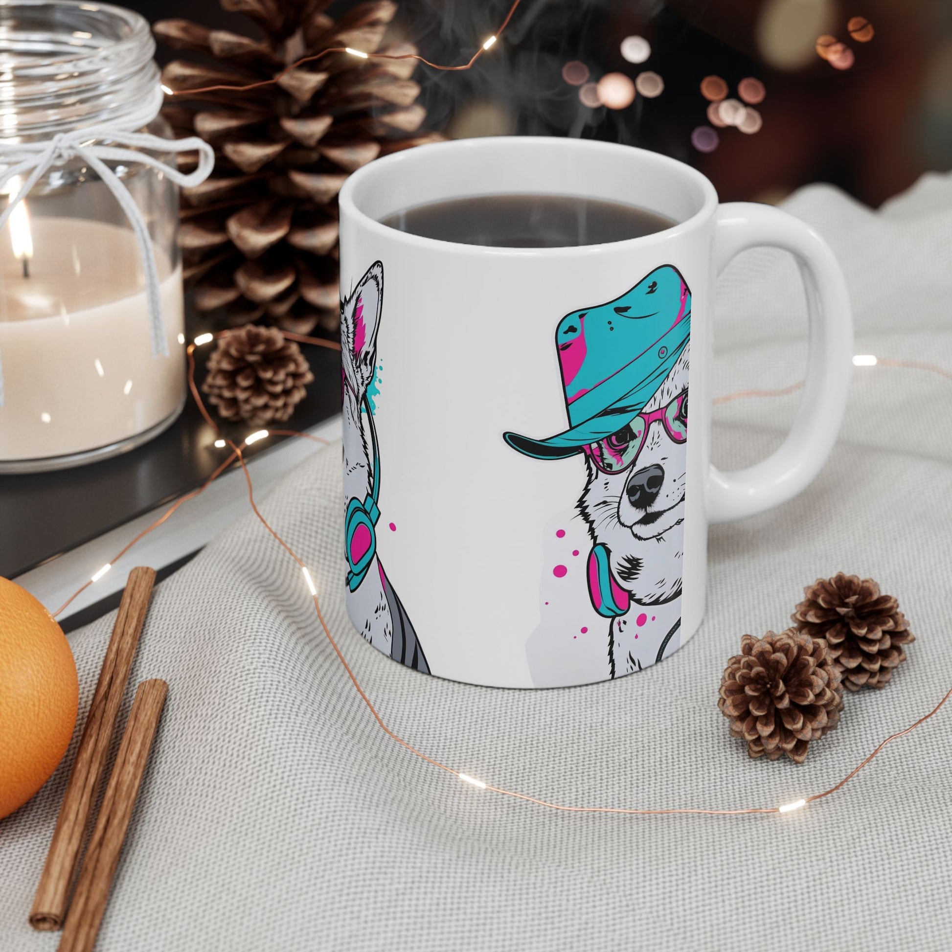 Bright, playful, and a little bit rebellious — this ceramic mug brings a streetwise pup straight to your countertop. The illustration shows a confident dog wearing a fedora, pink sunglasses, and cyan headphones — a pop-art clash of neon that perks up slow mornings and fuels creative afternoons. The glossy white ceramic makes the colors pop so the design stays sharp through daily use. Sip coffee, tea, or late-night hot chocolate while enjoying a design that feels like a soundtrack to city walks, studio sessions, and laid-back hangouts.
