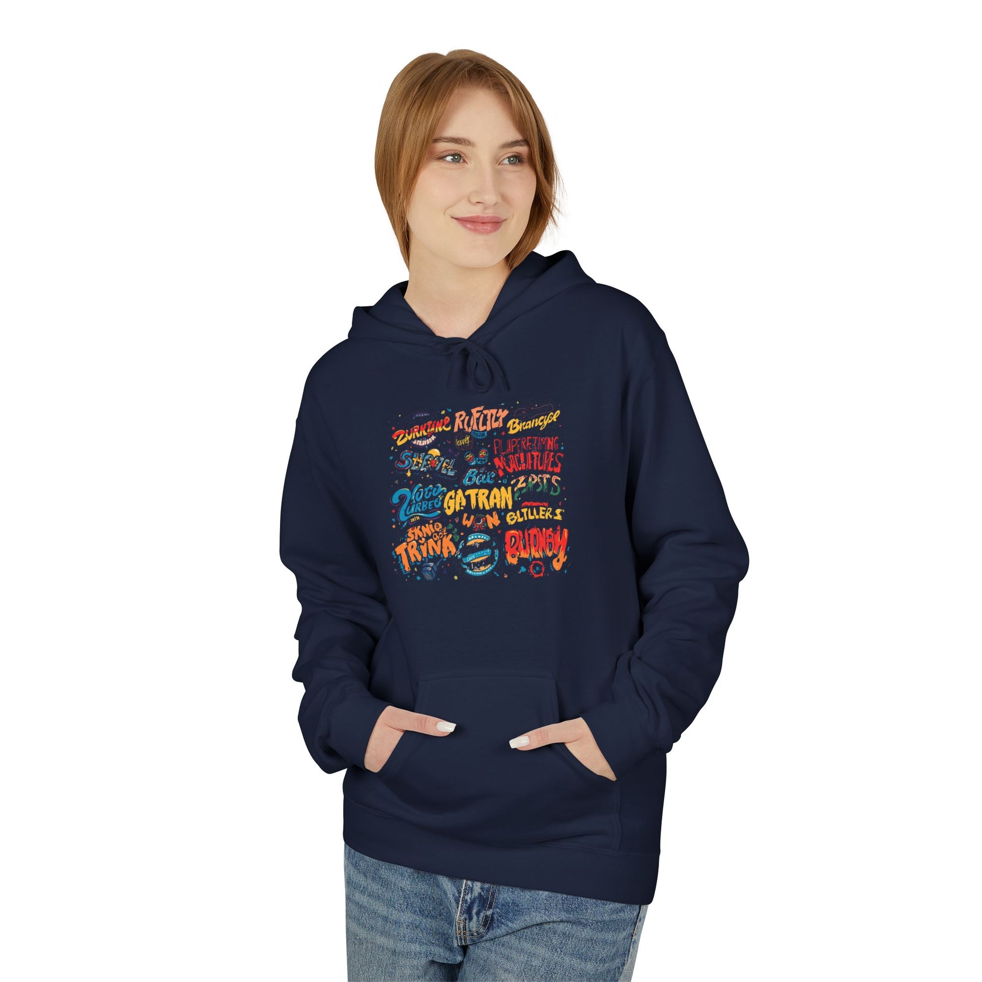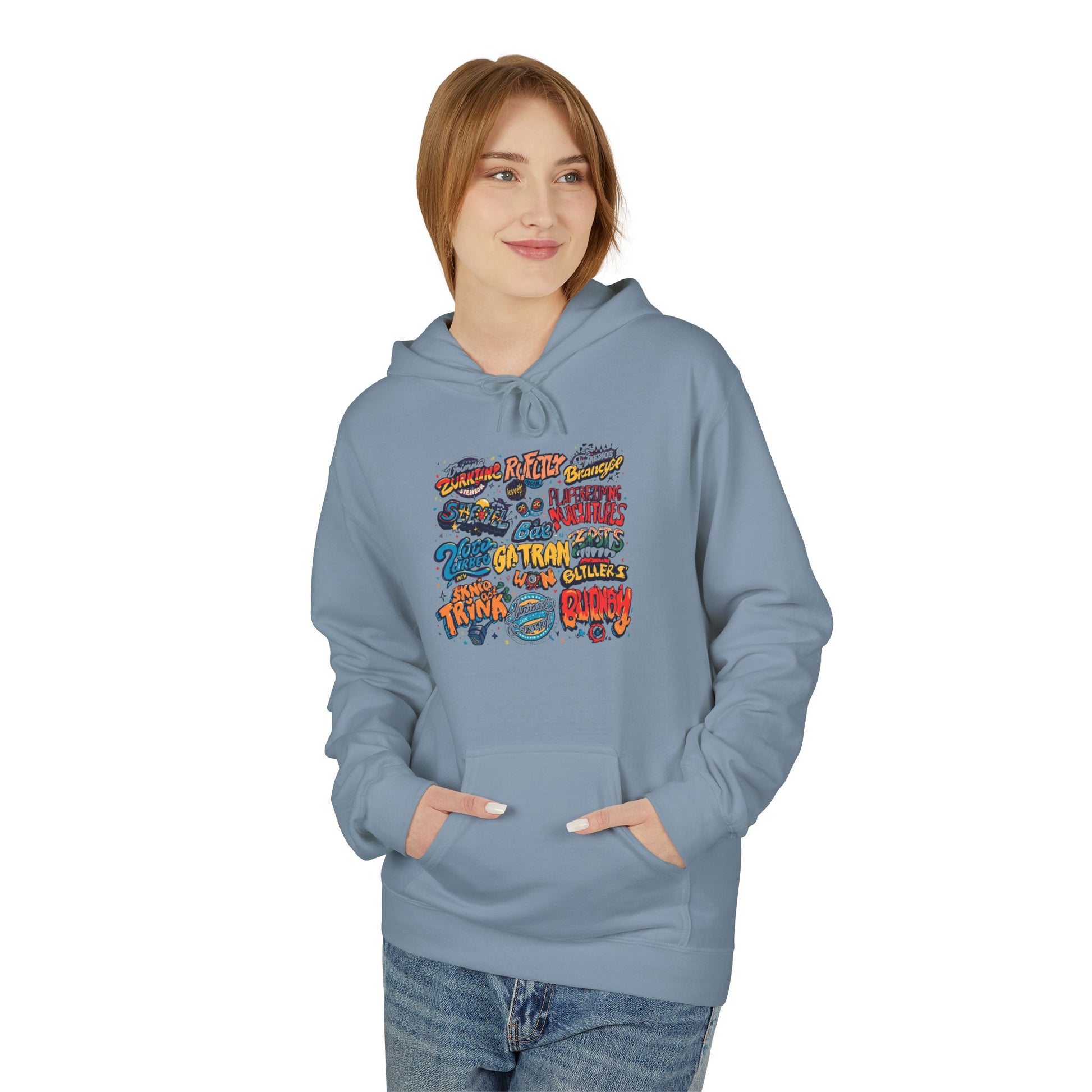 A vibrant retro sticker collage hoodie with personality and comfort.