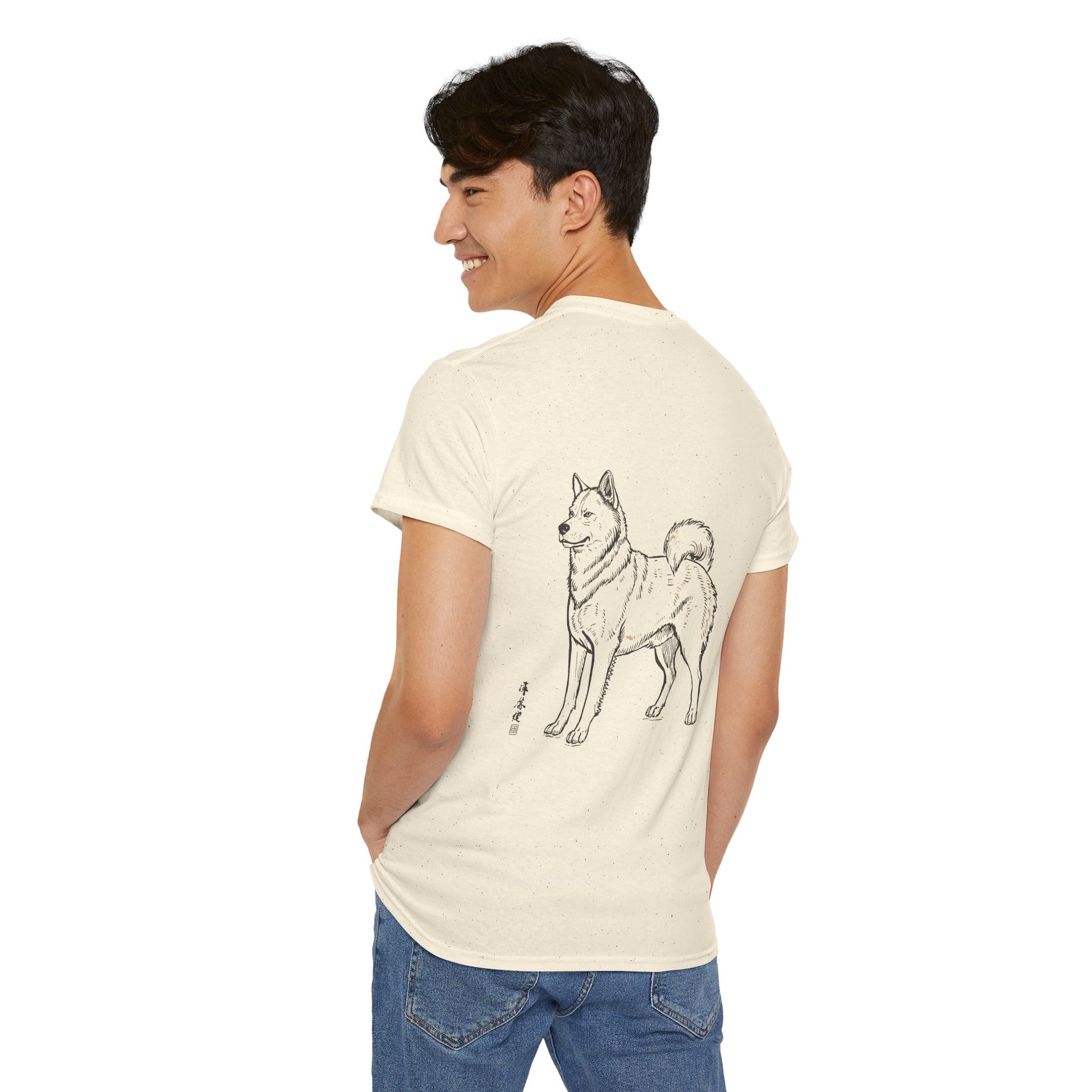 This T-shirt features a clean minimalist Korean Jindo Dog emblem on the front chest and a bold hand-drawn Jindo line art illustration on the back.