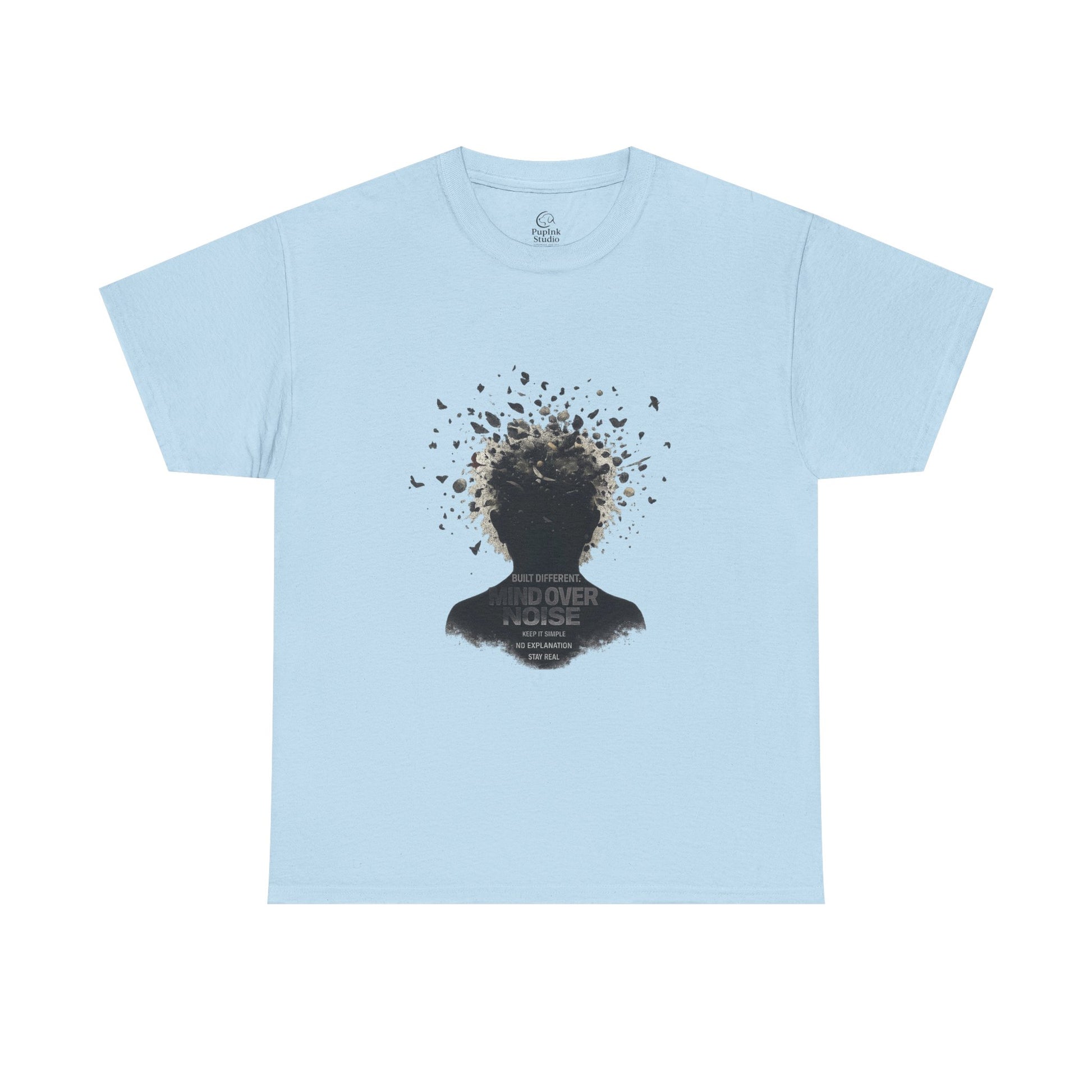 The design subtly incorporates the message “Built Different · Mind Over Noise · Keep It Simple · No Explanation · Stay Real” within the artwork