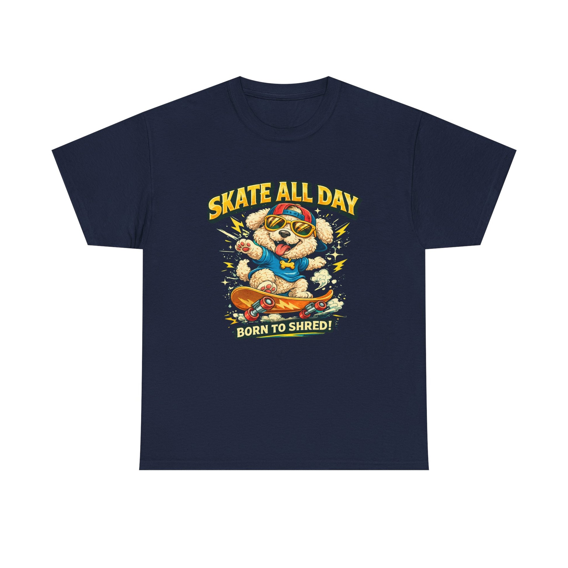 This T shirt features a front only illustrated skateboarding dog paired with bold Skate All Day typography
