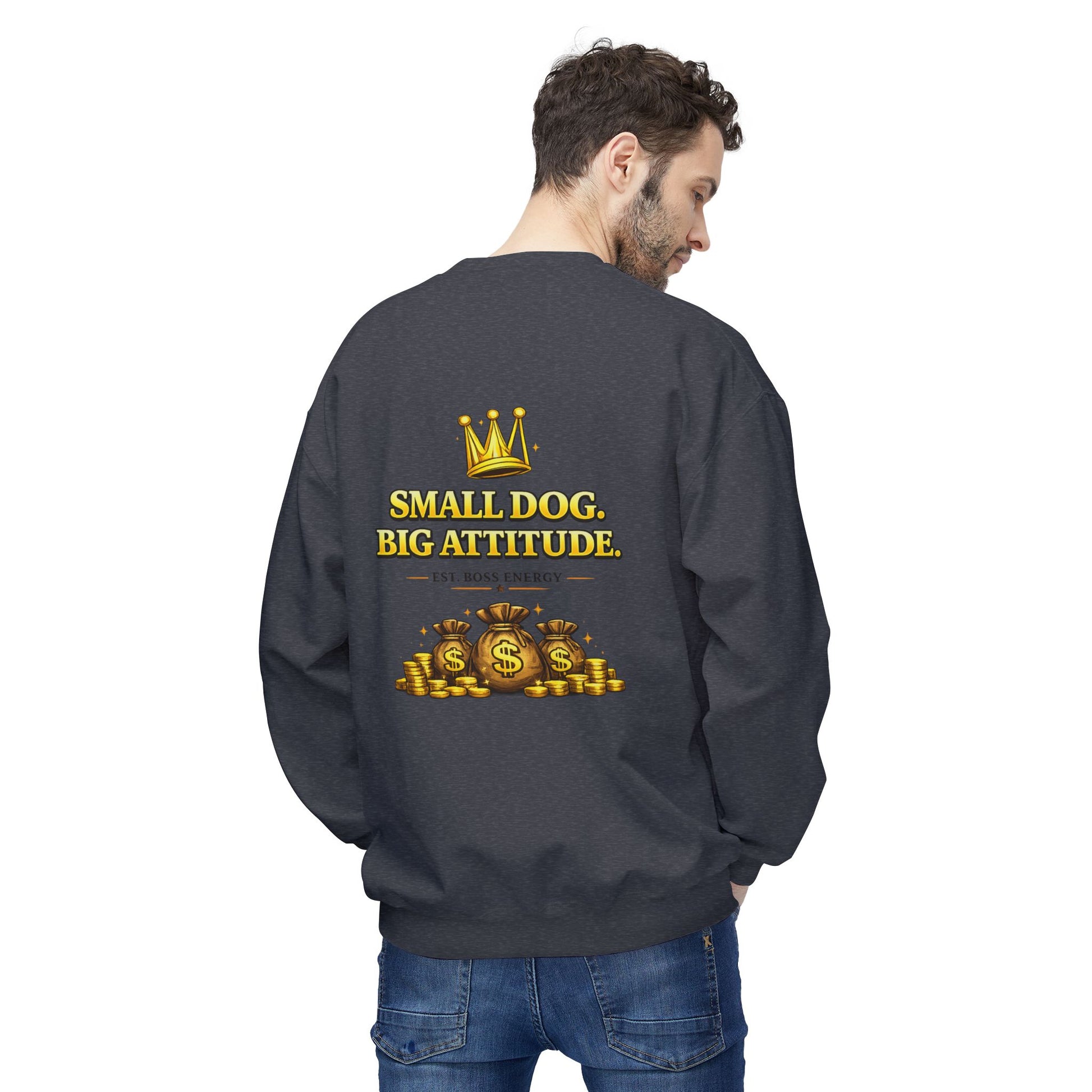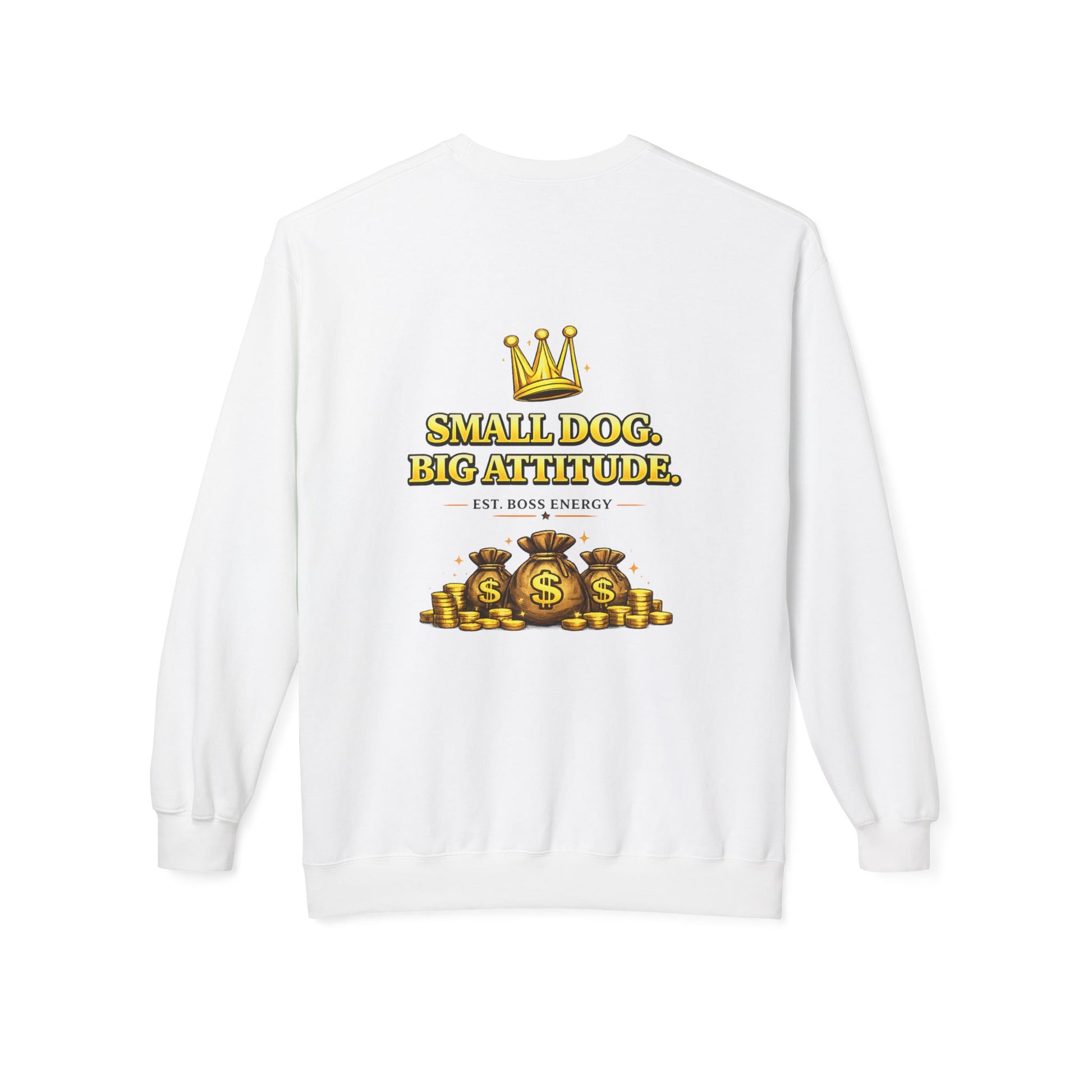 The back showcases a bold centered “Small Dog. Big Attitude.” graphic with crown and money bags symbolizing power confidence and success