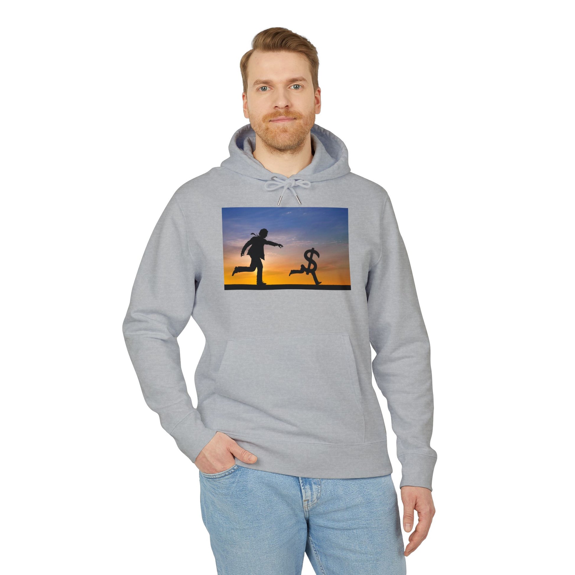 The sunset silhouette graphic symbolizes freedom, choice, and the moment where you decide what truly matters—money or meaning.