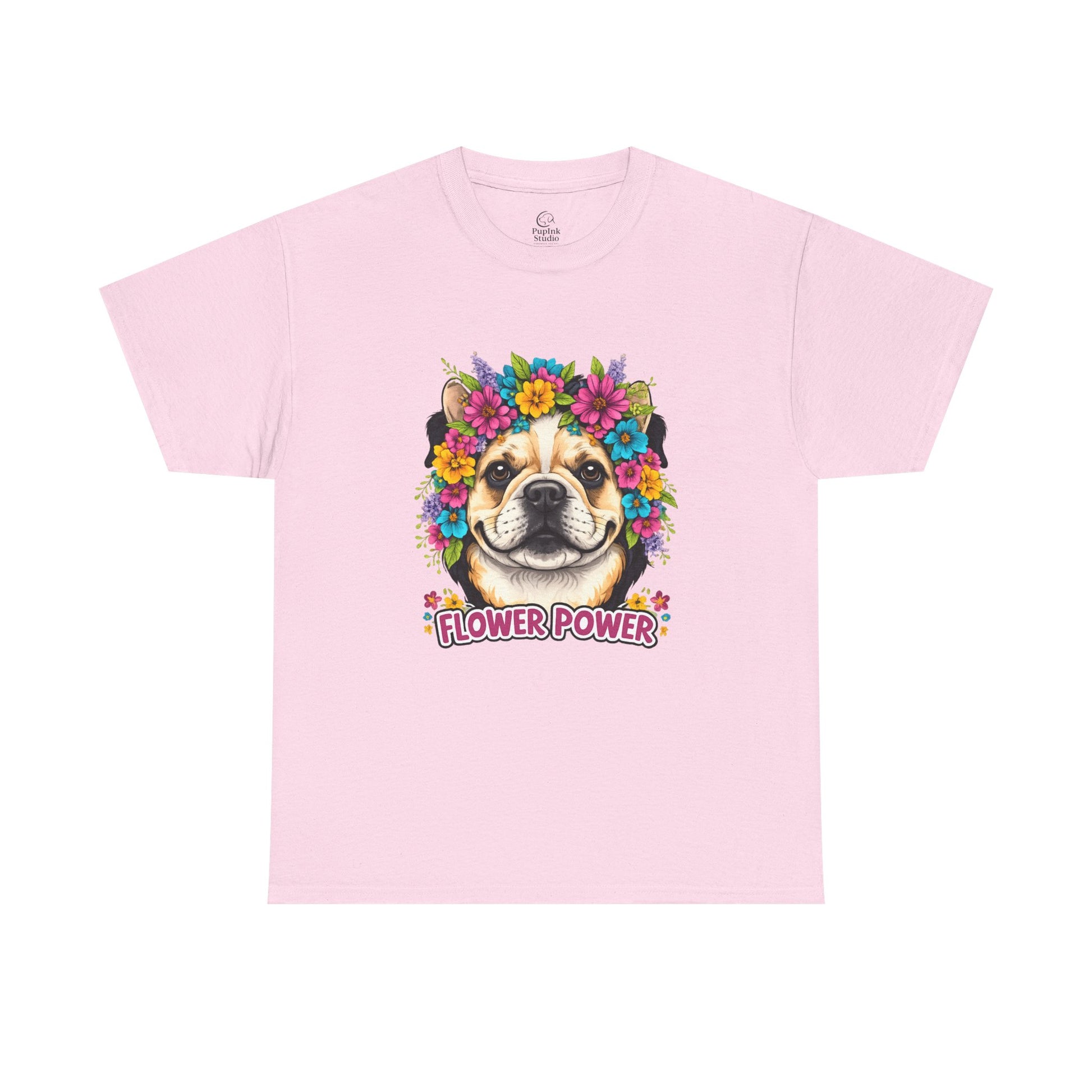 This T shirt features a front only illustrated dog portrait surrounded by vibrant florals and a bold Flower Power slogan