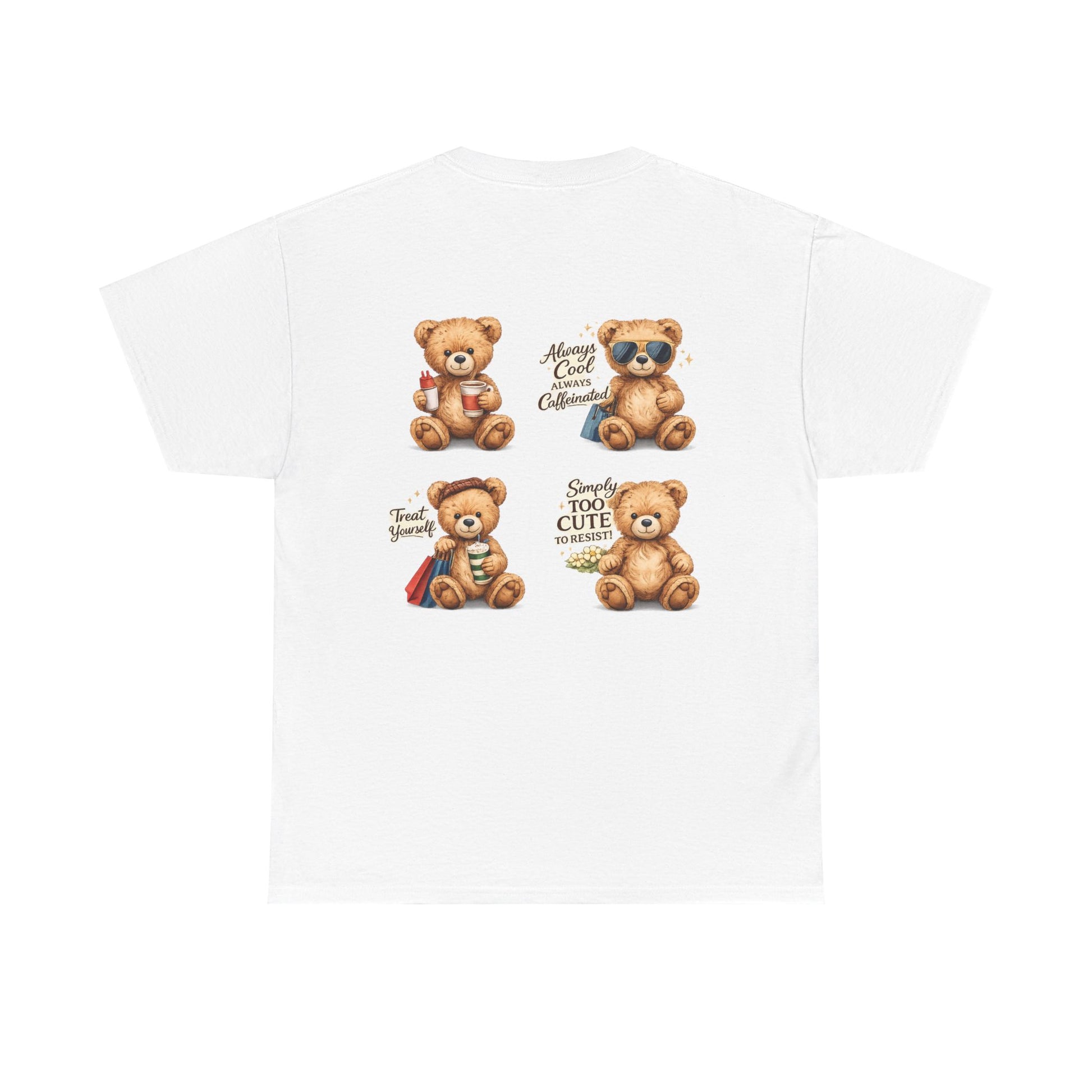 This T-shirt features a small cute bear emblem on the front chest paired with a bold four-scene bear illustration on the back