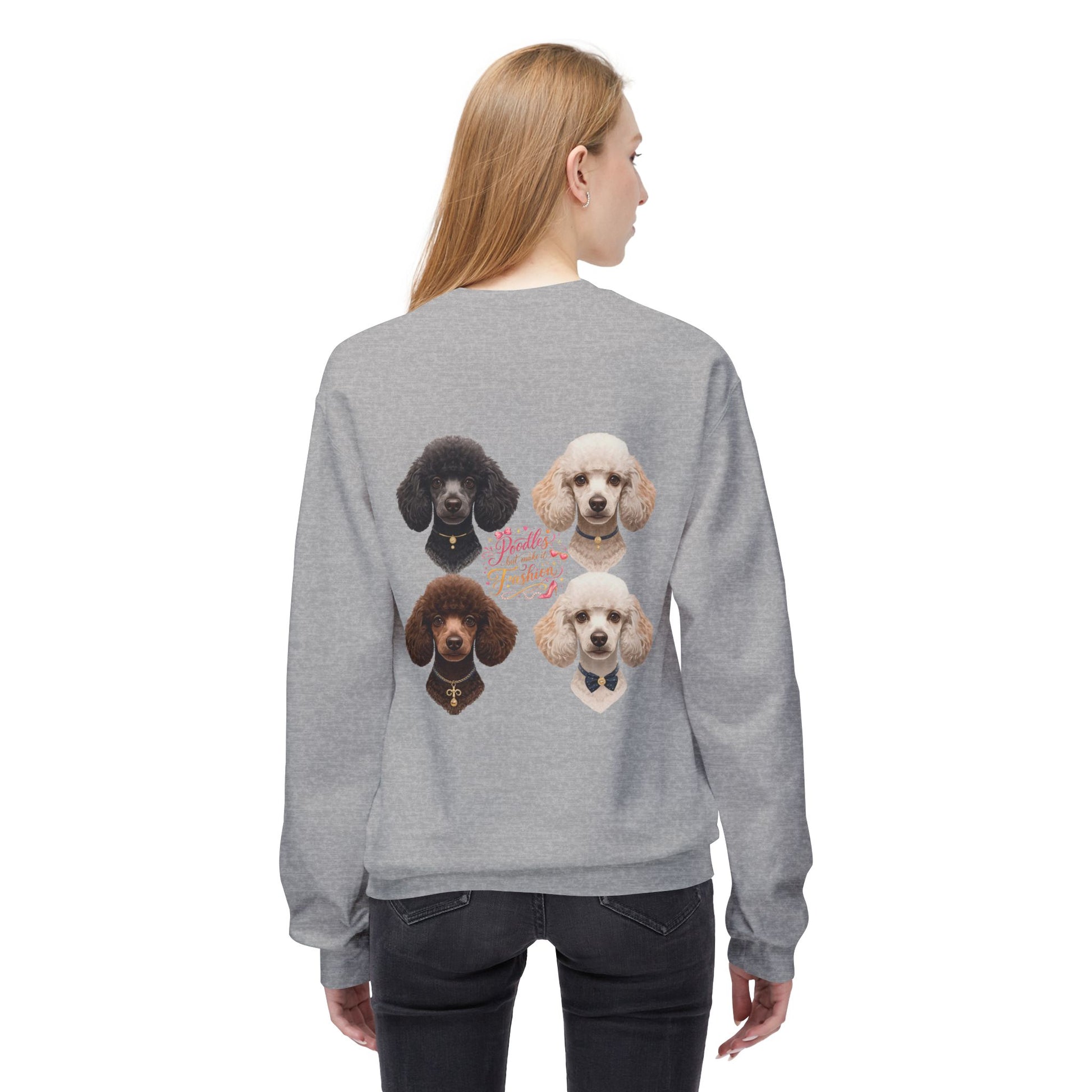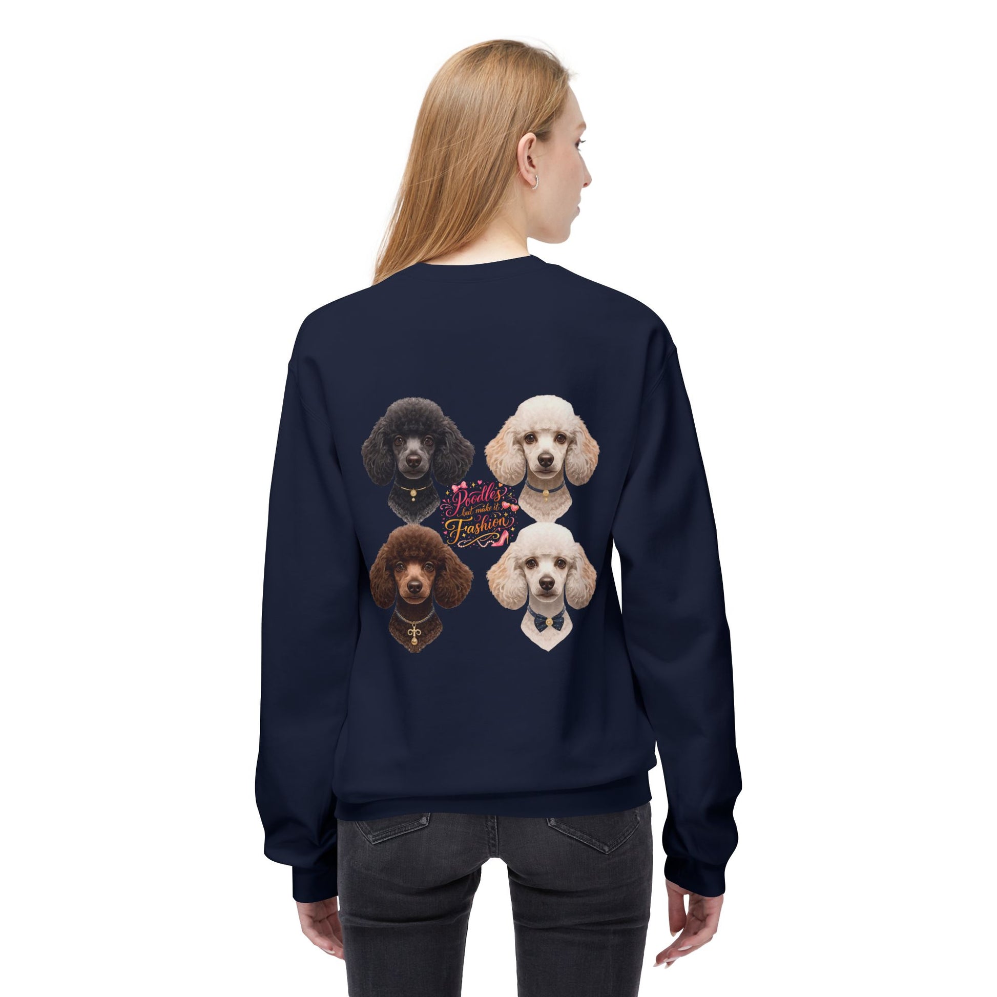 This sweatshirt features a clean, minimal front and a bold full-back graphic showcasing four beautifully styled poodles with the phrase “Poodles But Make It Fashion”