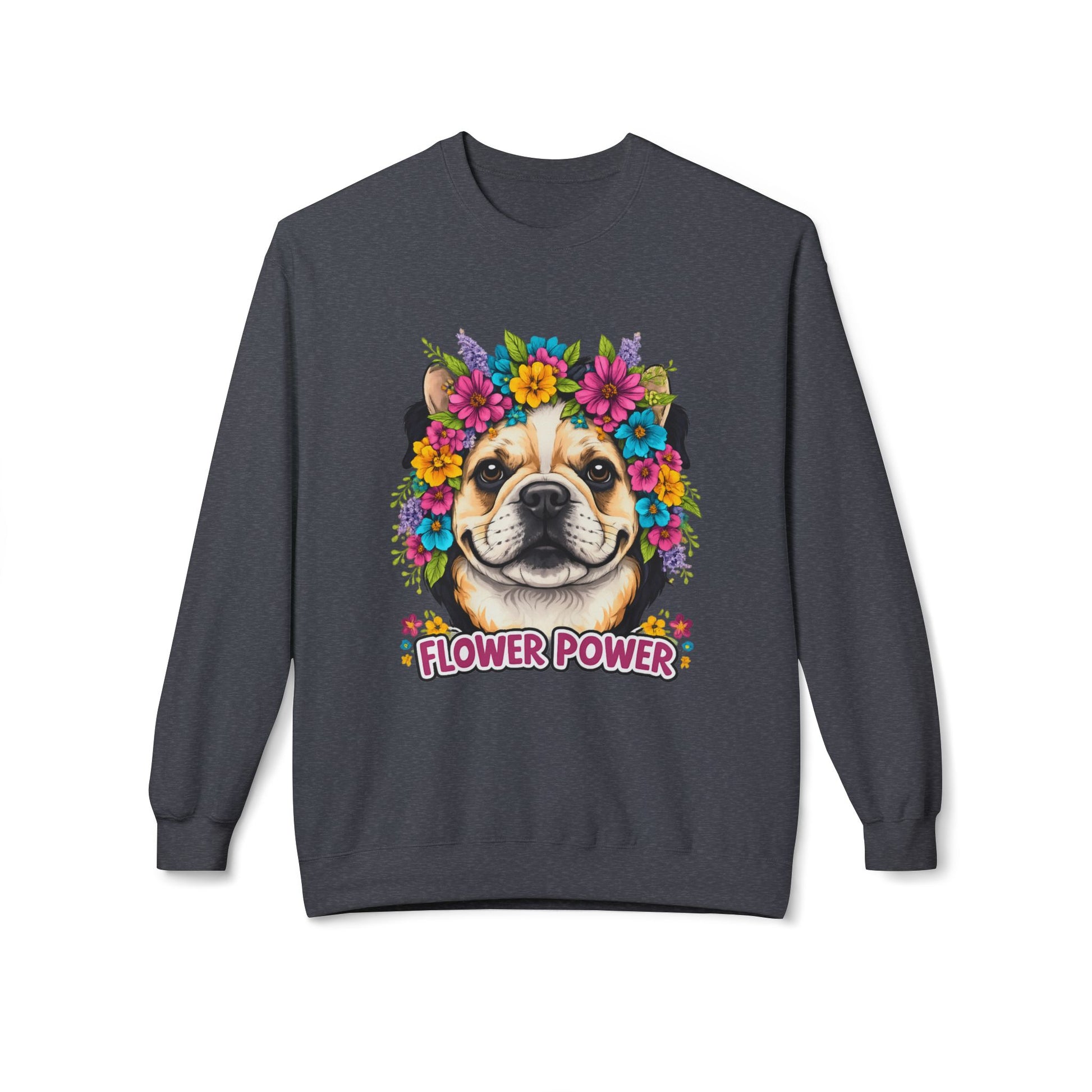 This sweater showcases a front only illustrated dog graphic crowned with vibrant flowers and playful typography