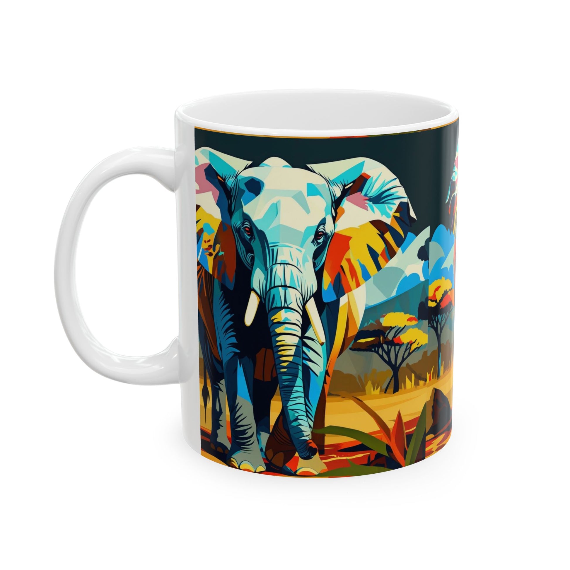 Bring a bold splash of the savanna to your morning ritual. This ceramic mug features a vibrant, geometric elephant wandering a warm landscape — colors that pop against the glossy white ceramic body. It feels substantial in your hands thanks to a comfortable C-handle and a shiny finish that makes the artwork sing. Use it as your everyday coffee or tea companion while you plan adventures, remember a favorite trip, or simply slow down and savor quiet moments. The design speaks to people who love wildlife, bright art, and conversation-starting pieces on the kitchen shelf.