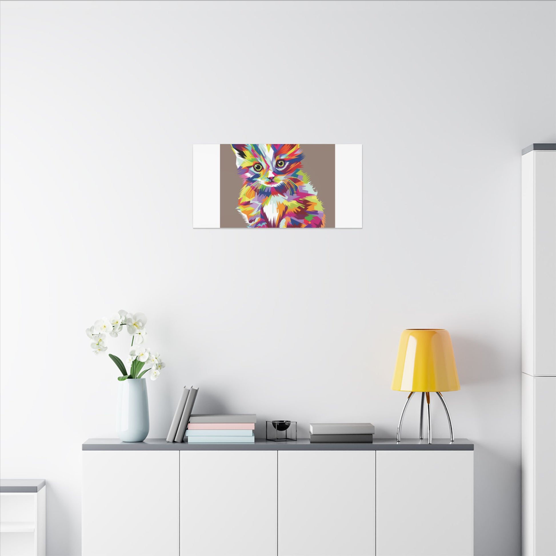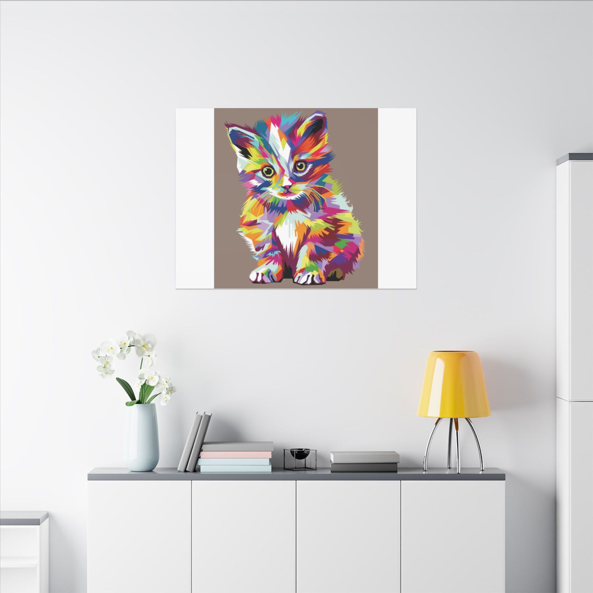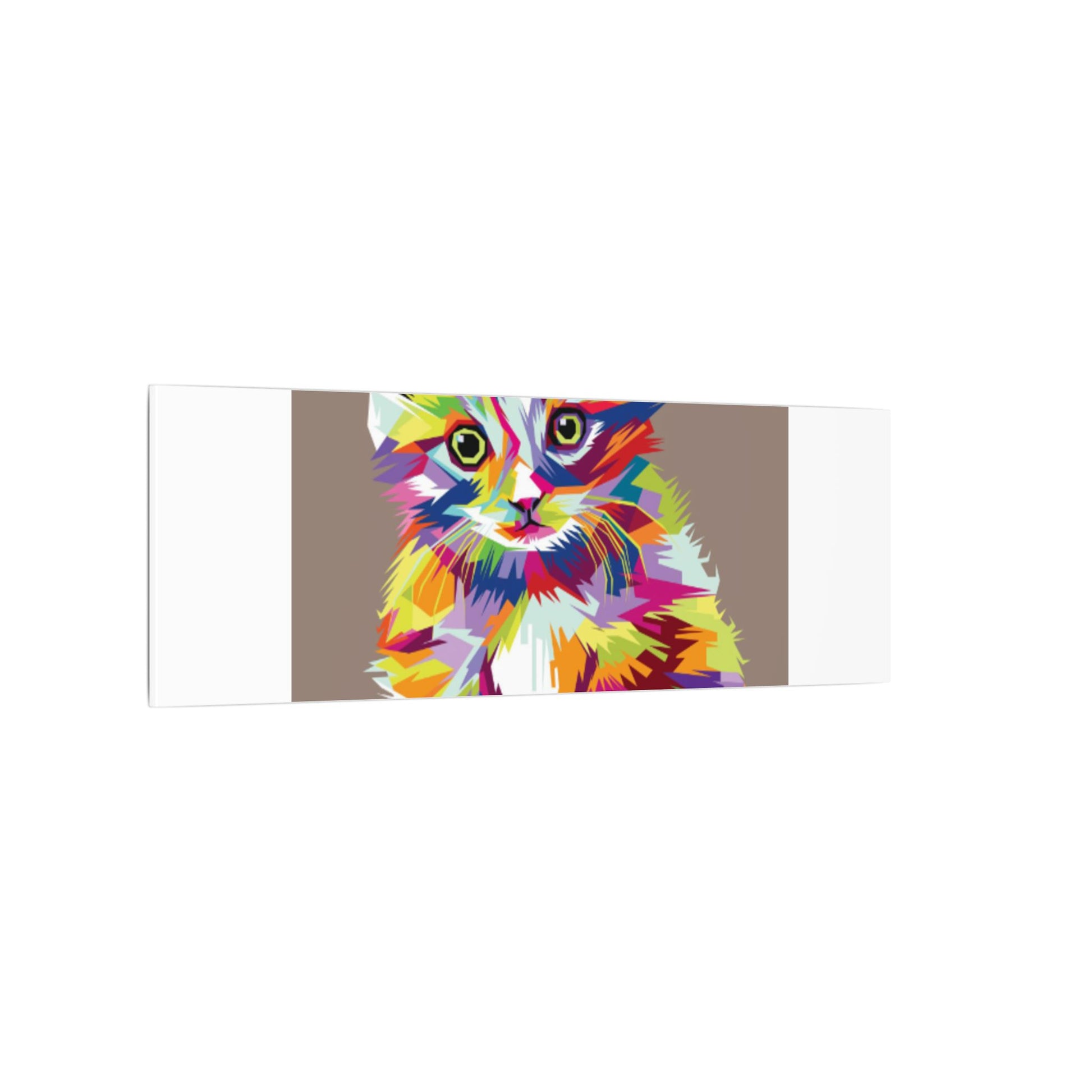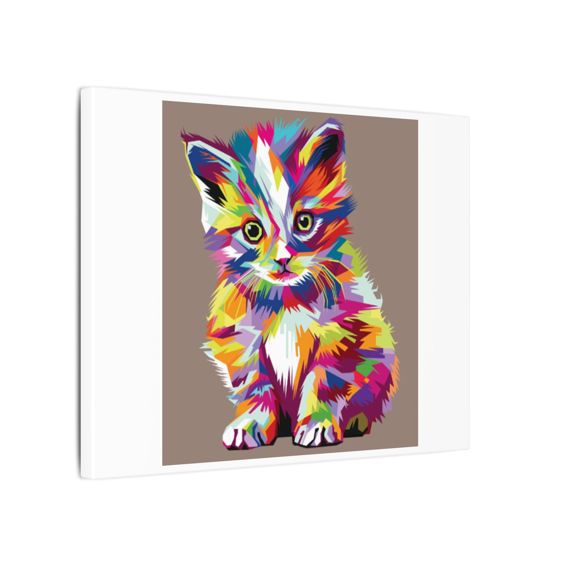 A bright, playful canvas print that brings color and warmth to a room. The stretched matte canvas showcases a rainbow-hued kitten rendered in bold, painterly strokes against a neutral background — lively without overwhelming. Lightweight yet sturdy, the print arrives ready to hang with soft rubber dots on the back to keep it steady and protect your walls. The textured canvas surface and vibrant latex inks preserve fine detail and saturation, so the kitten’s curious expression and energetic palette stay vivid for years. It suits a nursery wall, a creative studio, or a cozy reading nook where grown-up whimsy and handcrafted quality meet.