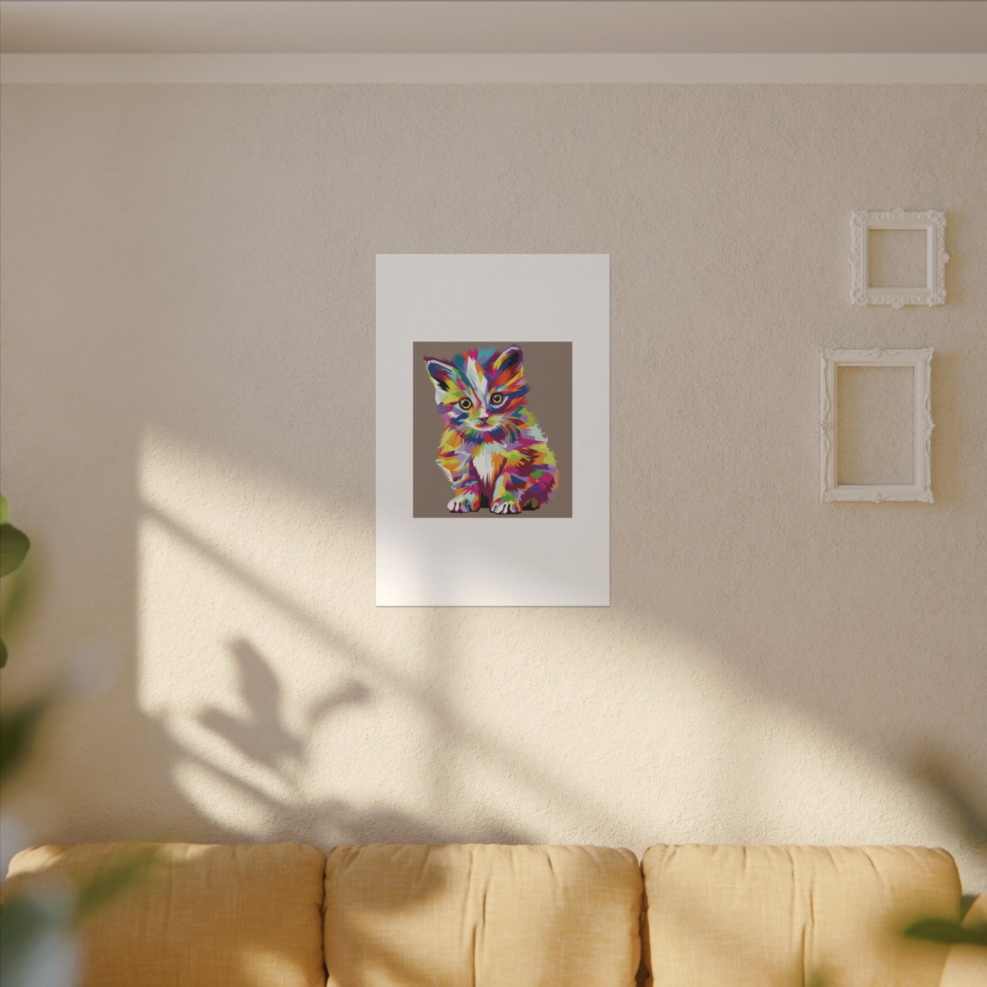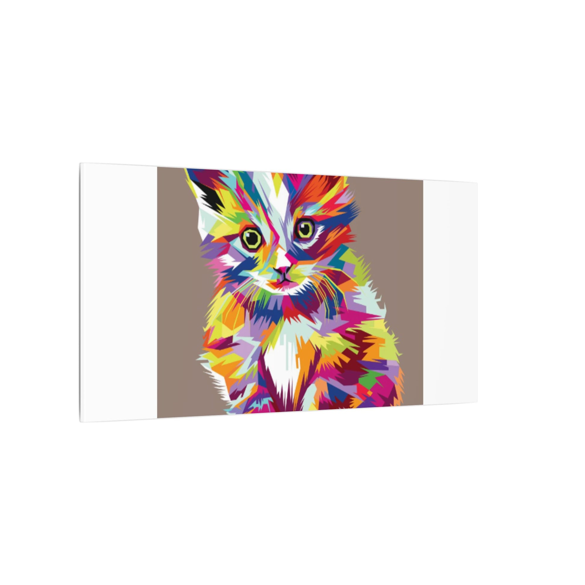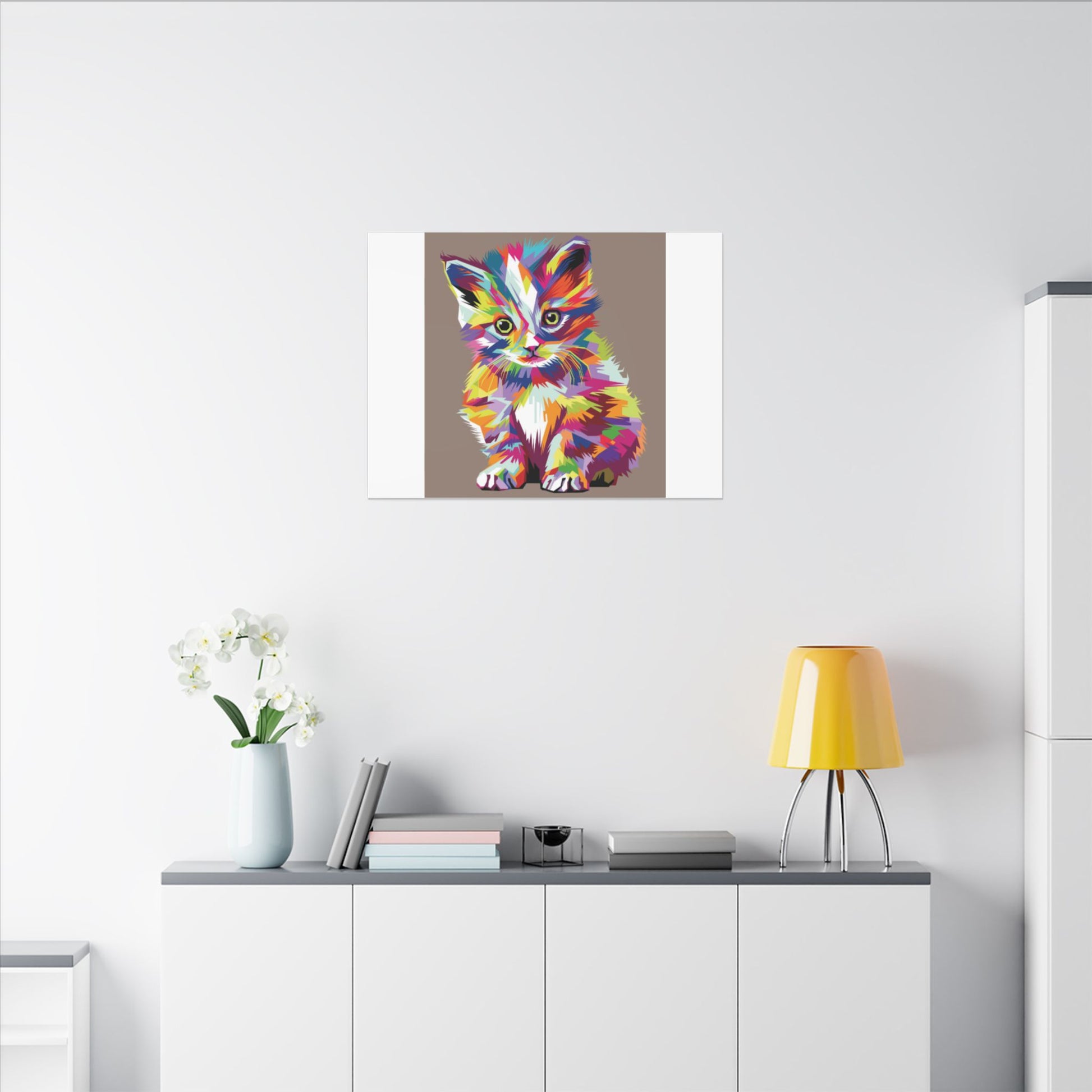 A bright, playful canvas print that brings color and warmth to a room. The stretched matte canvas showcases a rainbow-hued kitten rendered in bold, painterly strokes against a neutral background — lively without overwhelming. Lightweight yet sturdy, the print arrives ready to hang with soft rubber dots on the back to keep it steady and protect your walls. The textured canvas surface and vibrant latex inks preserve fine detail and saturation, so the kitten’s curious expression and energetic palette stay vivid for years. It suits a nursery wall, a creative studio, or a cozy reading nook where grown-up whimsy and handcrafted quality meet.