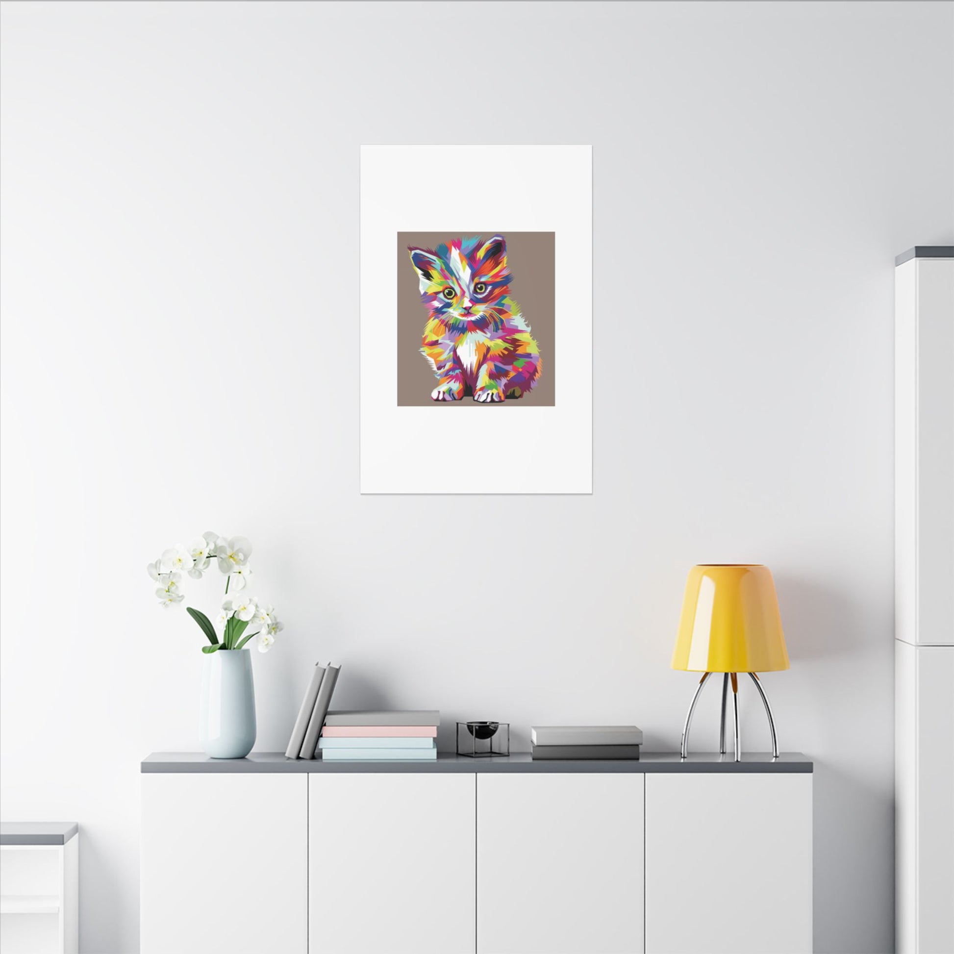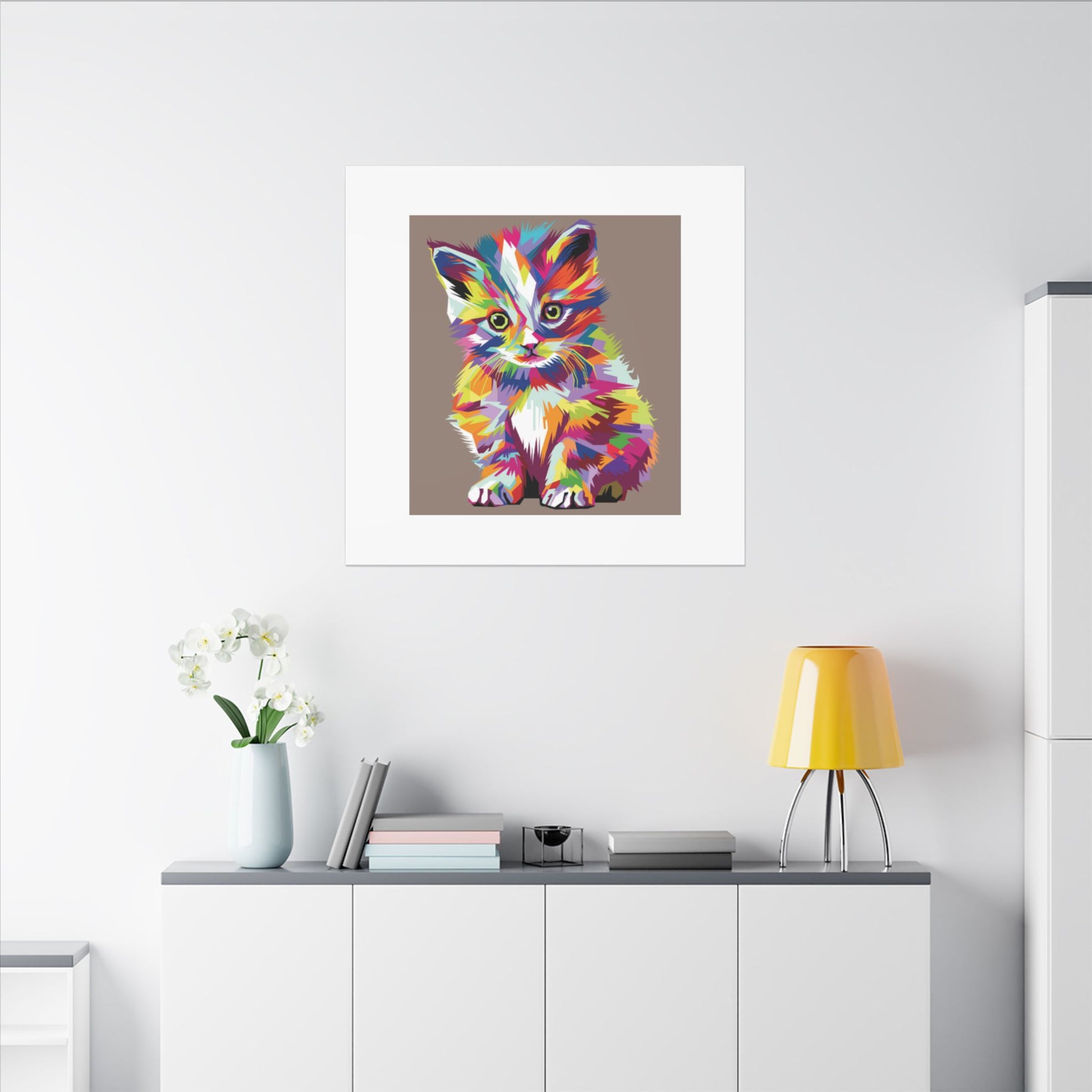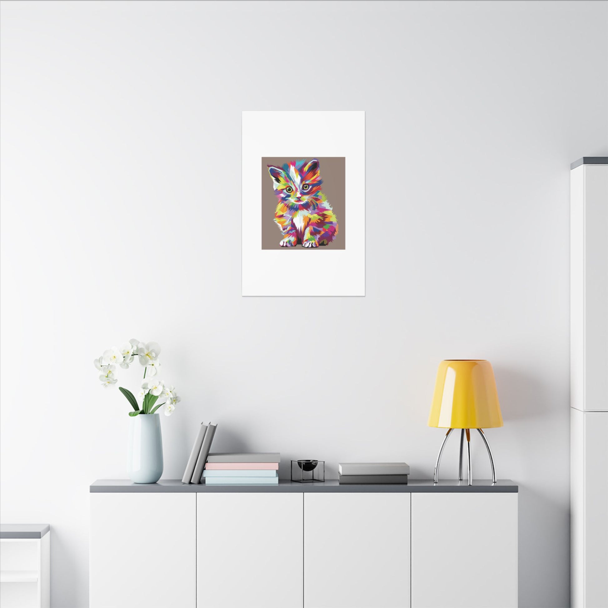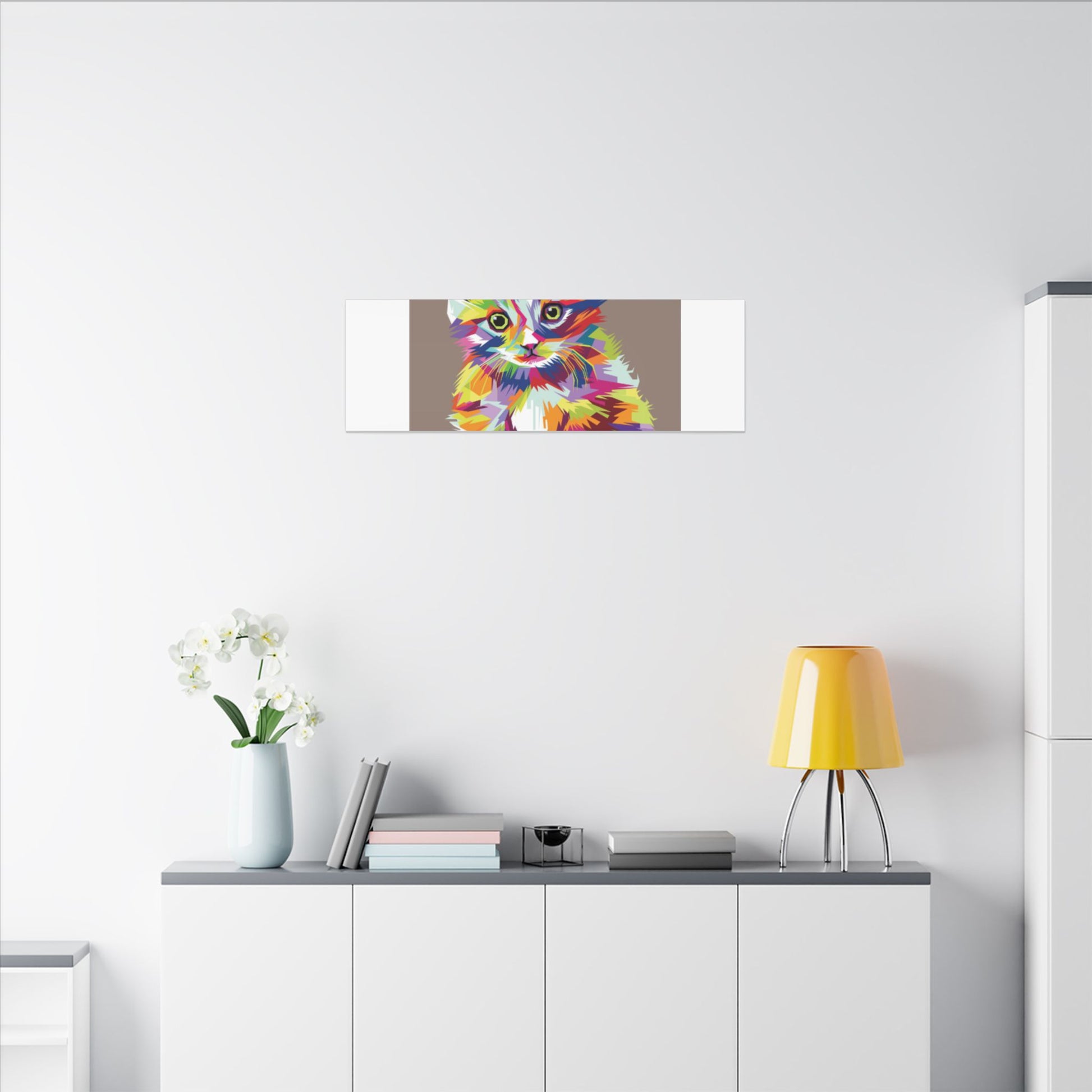 A bright, playful canvas print that brings color and warmth to a room. The stretched matte canvas showcases a rainbow-hued kitten rendered in bold, painterly strokes against a neutral background — lively without overwhelming. Lightweight yet sturdy, the print arrives ready to hang with soft rubber dots on the back to keep it steady and protect your walls. The textured canvas surface and vibrant latex inks preserve fine detail and saturation, so the kitten’s curious expression and energetic palette stay vivid for years. It suits a nursery wall, a creative studio, or a cozy reading nook where grown-up whimsy and handcrafted quality meet.