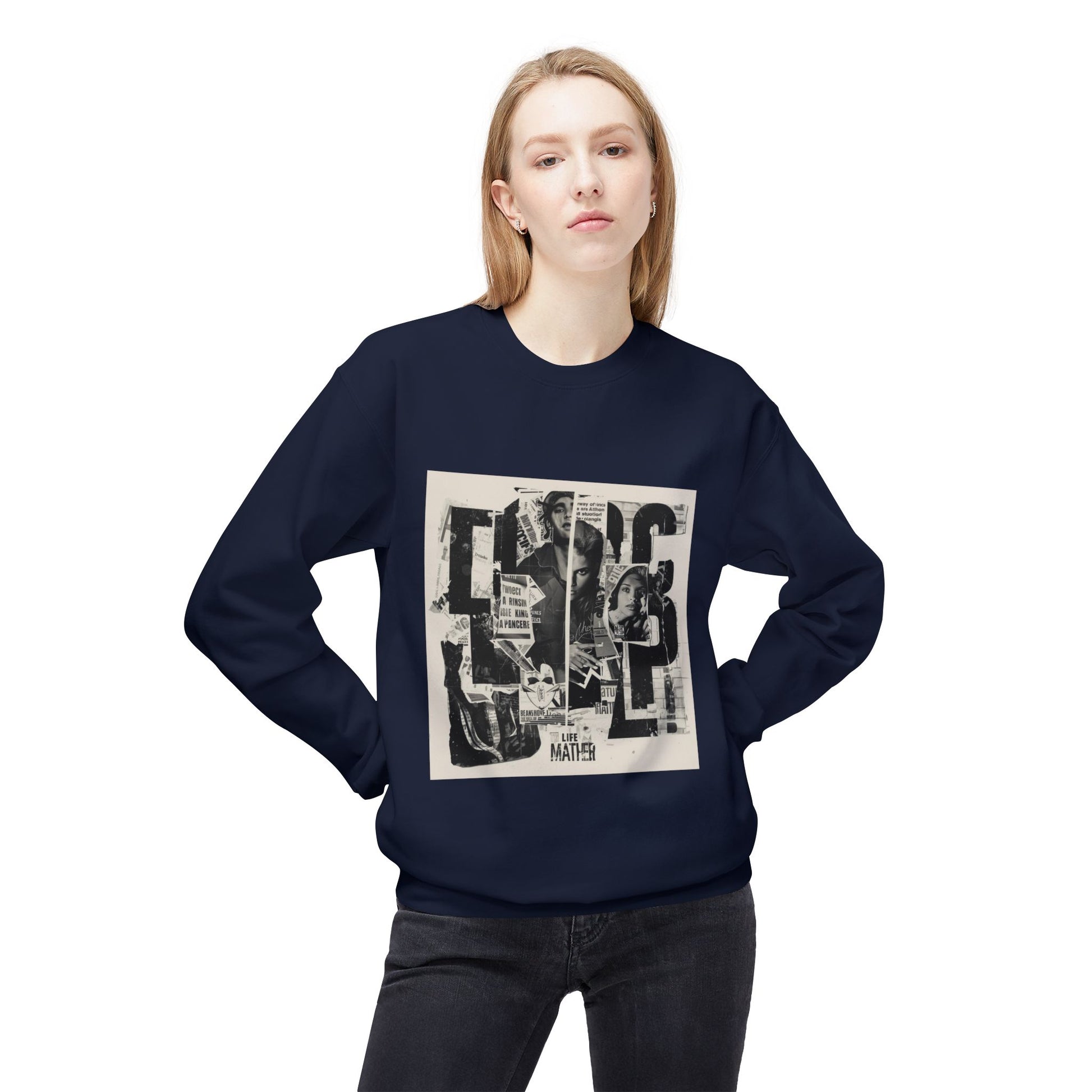 This sweater showcases the same collage graphic on the front only, keeping the design focused and intentional.