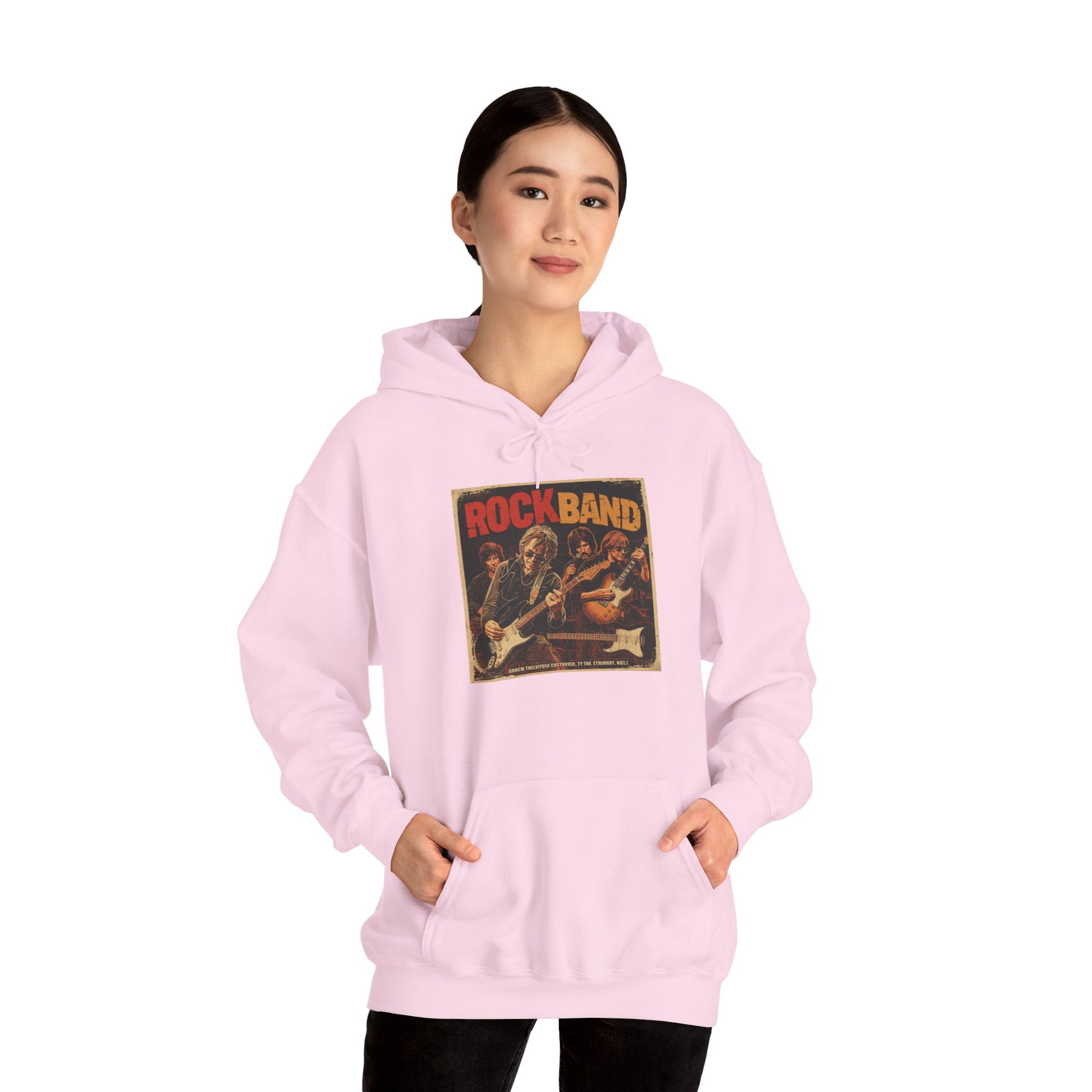 This hoodie features a bold vintage rock band collage graphic inspired by classic album covers and underground music culture.