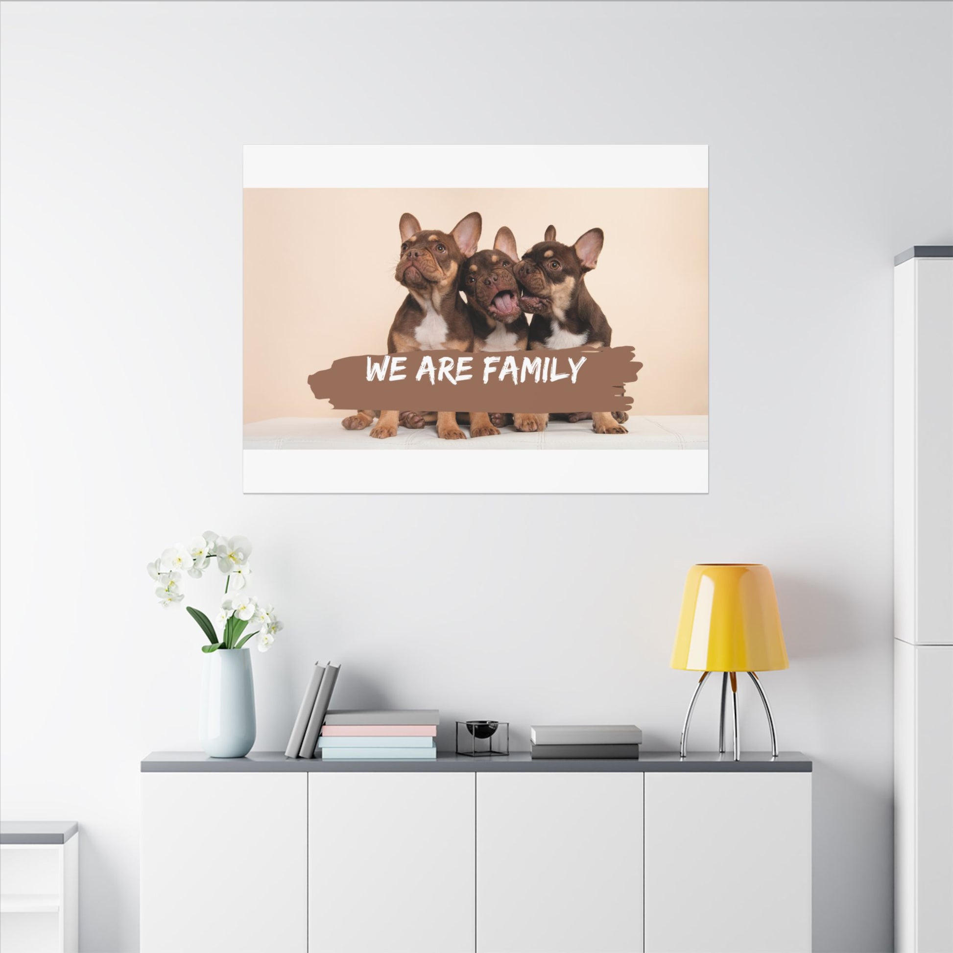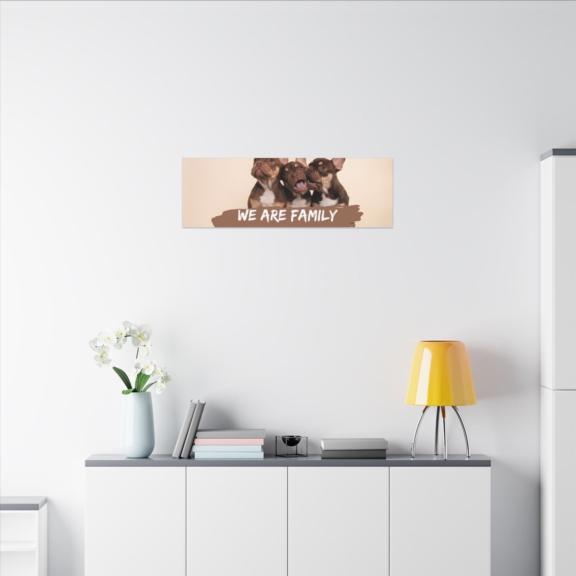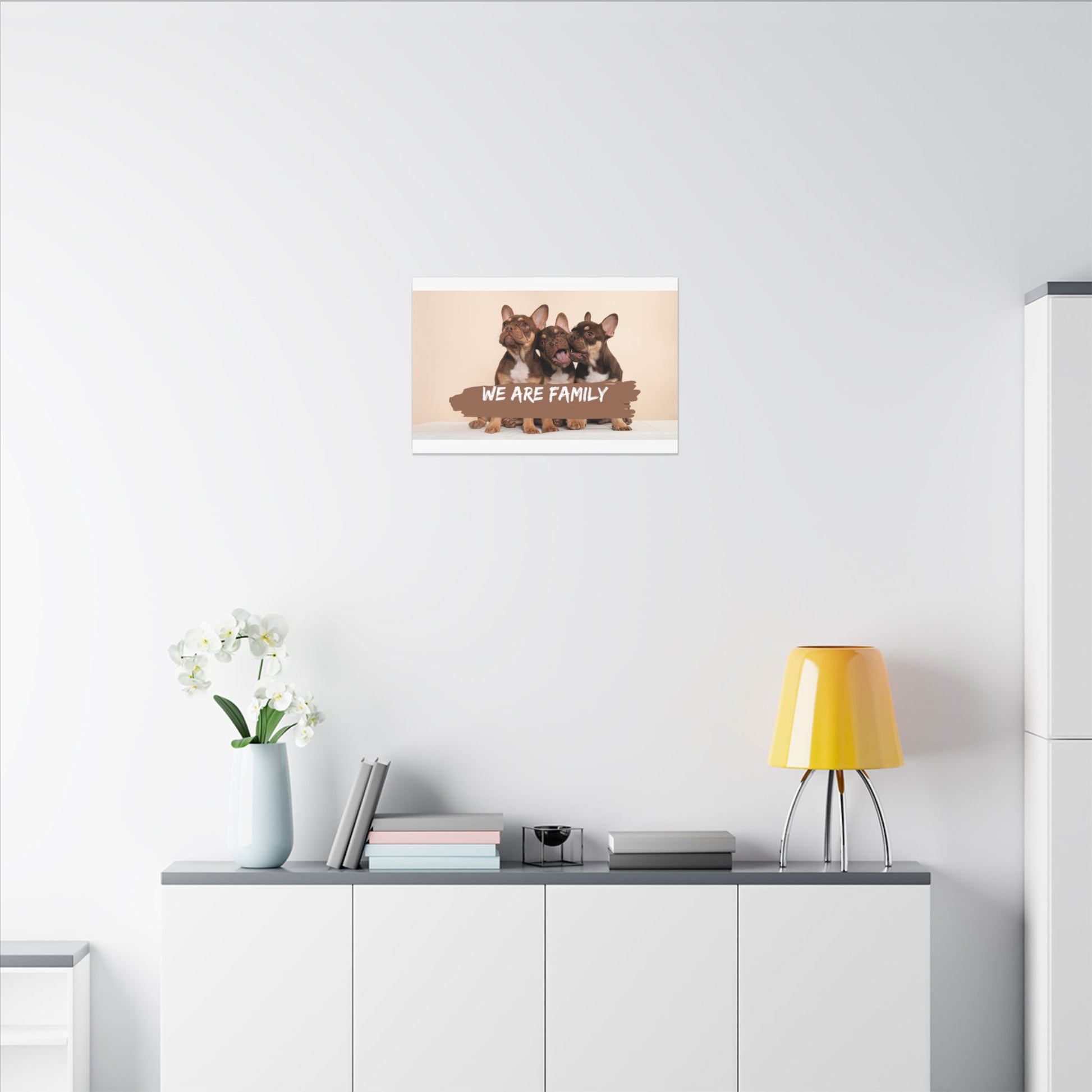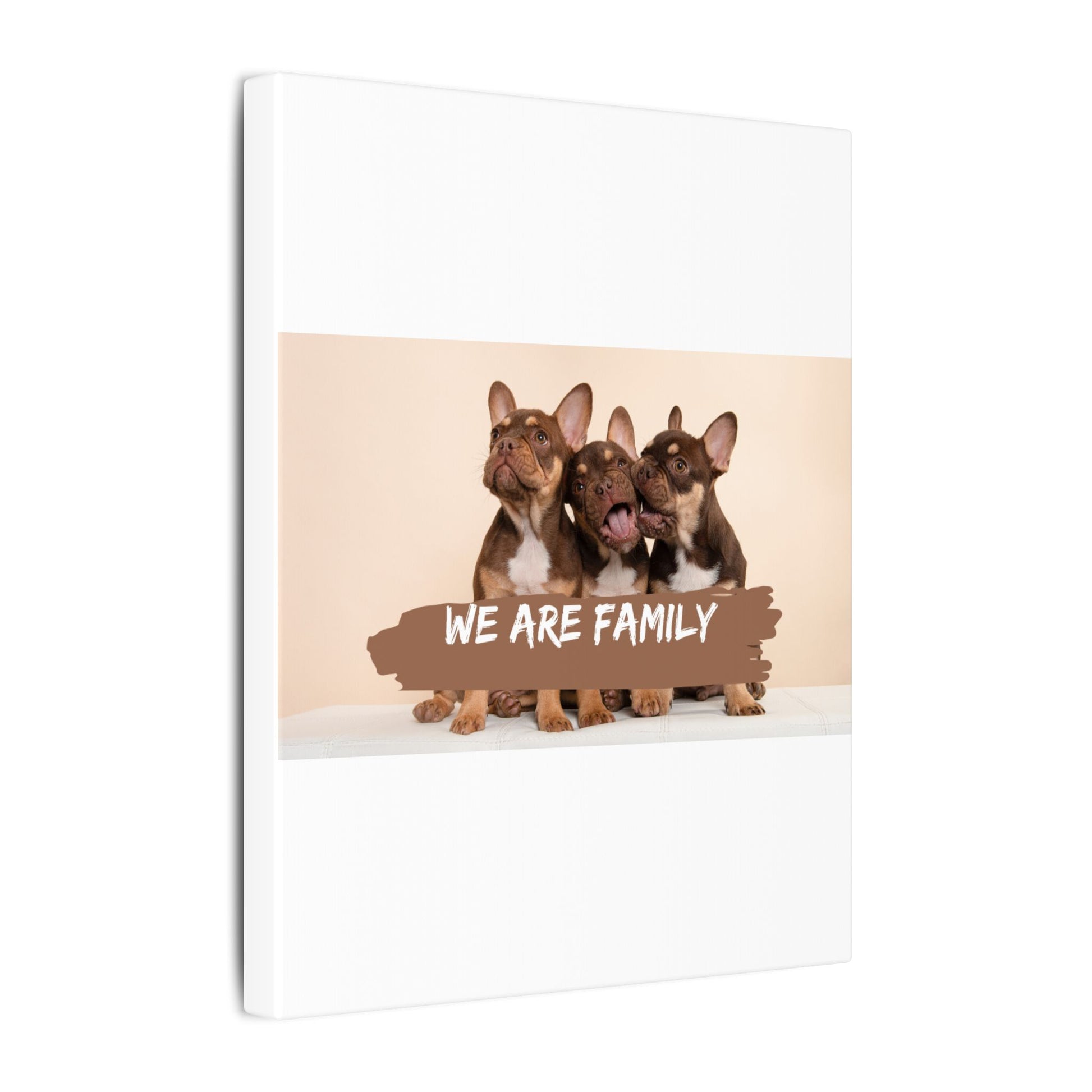 Warm, textured canvas print that brings a cozy, personal touch to a living room, hallway, or nursery. The stretched matte canvas features three playful French Bulldogs captured in a soft, neutral palette with a hand-painted brushstroke reading “WE ARE FAMILY.” Light-reflective, high-resolution printing gives depth to fur and subtle tones while the matte finish keeps glare to a minimum. The slim 0.75" profile sits close to the wall for a modern, gallery-inspired look. Built with responsibly sourced radiata pine stretcher bars and a durable cotton/poly canvas, this piece feels like a quiet, everyday reminder of belonging — a visual nudge toward laughter and home.