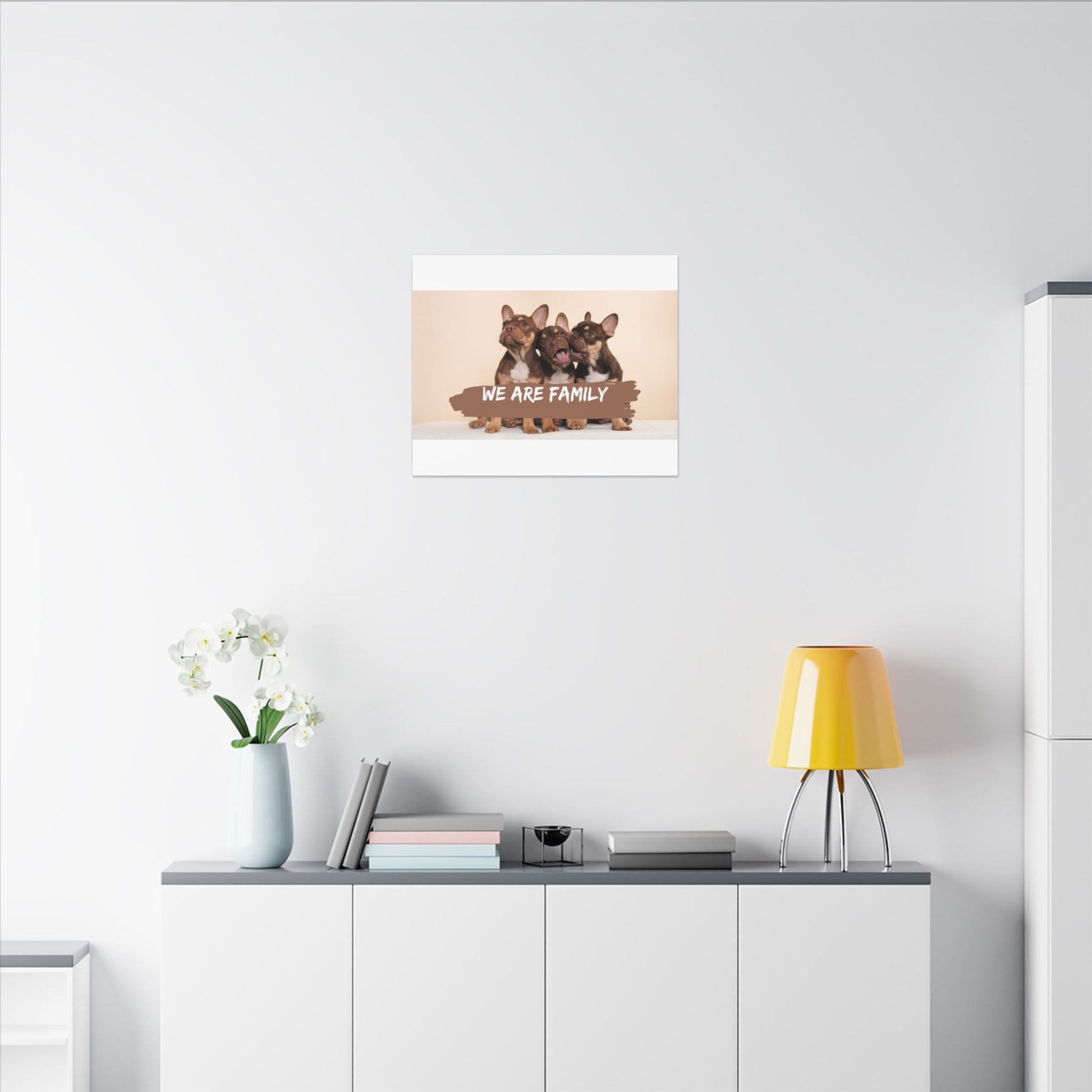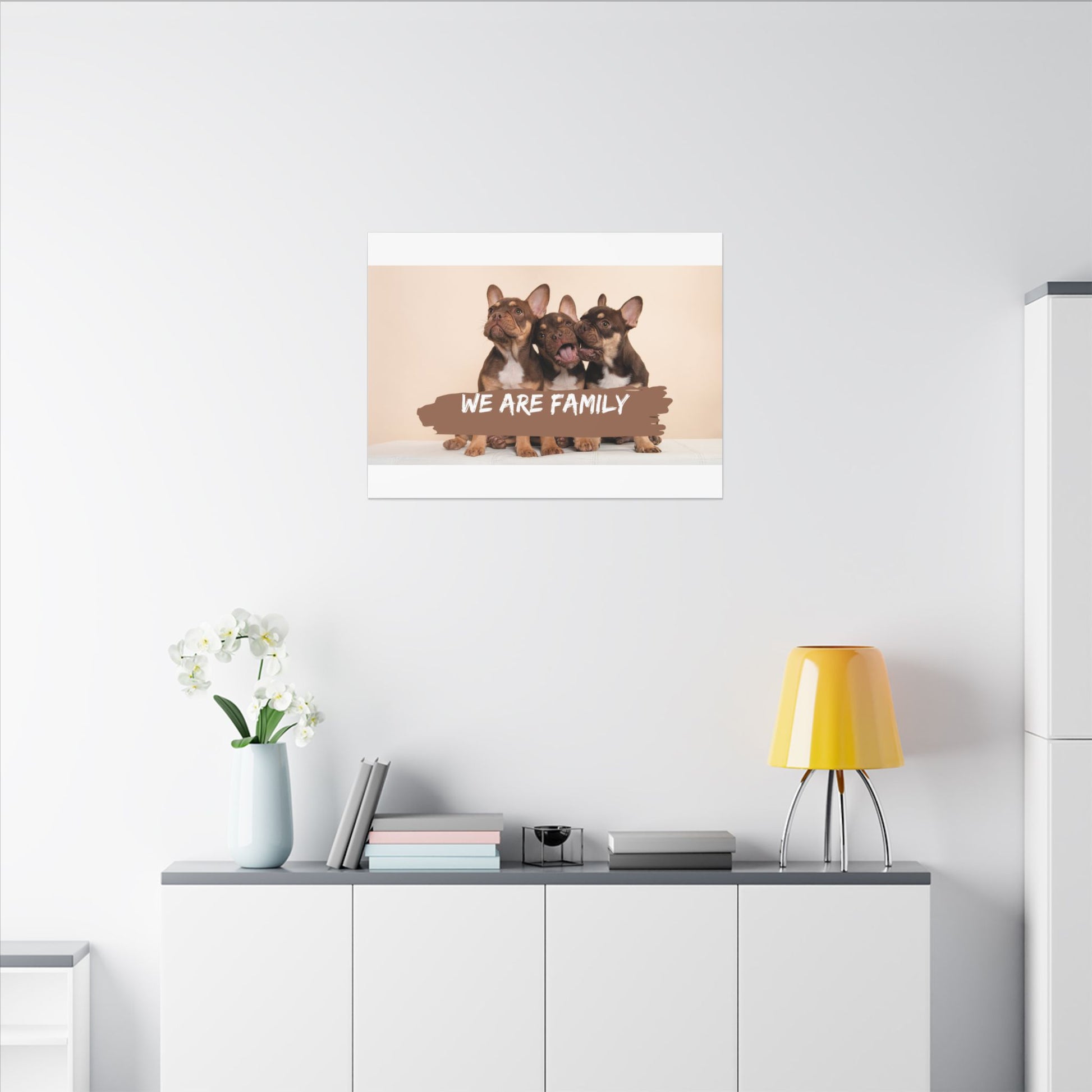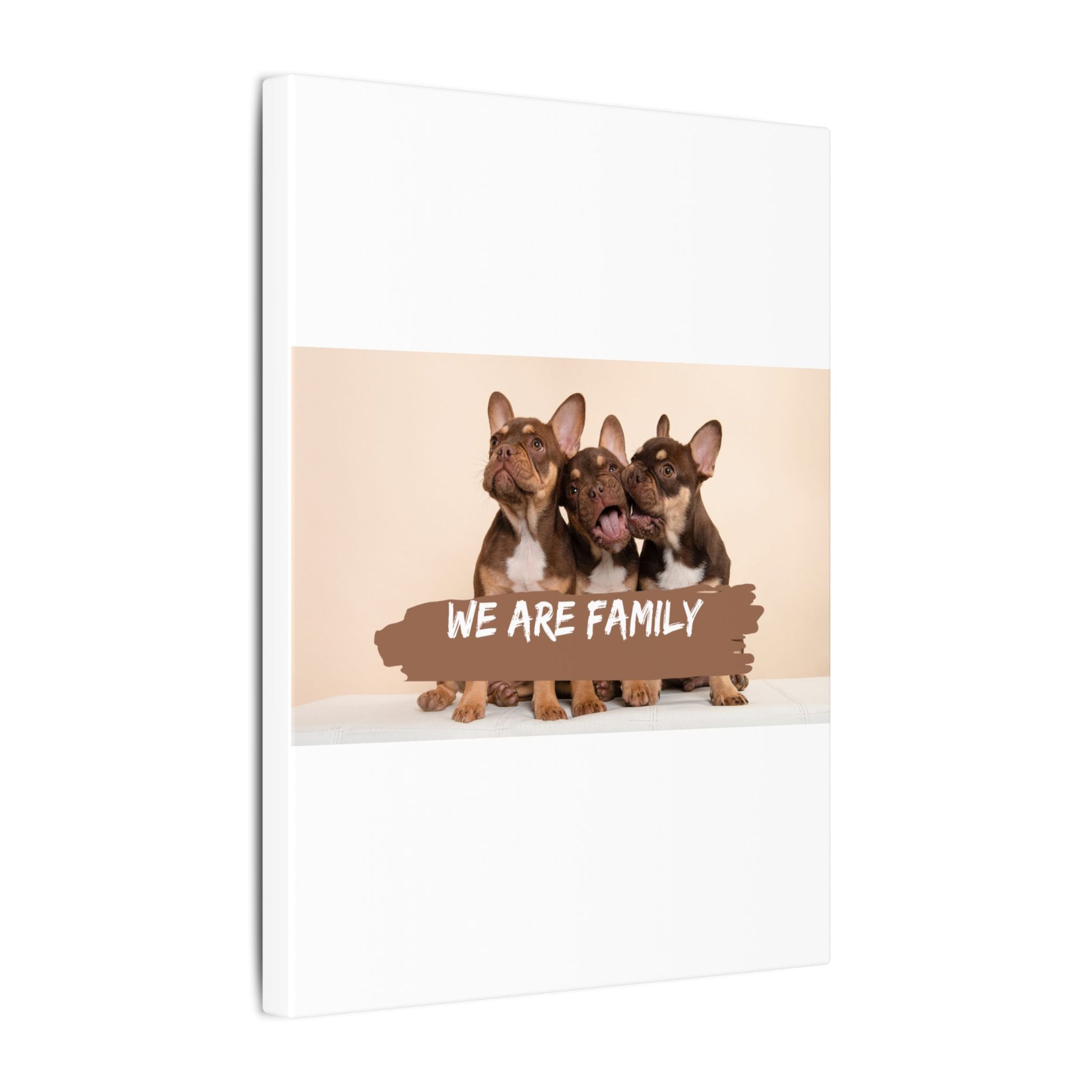 Warm, textured canvas print that brings a cozy, personal touch to a living room, hallway, or nursery. The stretched matte canvas features three playful French Bulldogs captured in a soft, neutral palette with a hand-painted brushstroke reading “WE ARE FAMILY.” Light-reflective, high-resolution printing gives depth to fur and subtle tones while the matte finish keeps glare to a minimum. The slim 0.75" profile sits close to the wall for a modern, gallery-inspired look. Built with responsibly sourced radiata pine stretcher bars and a durable cotton/poly canvas, this piece feels like a quiet, everyday reminder of belonging — a visual nudge toward laughter and home.