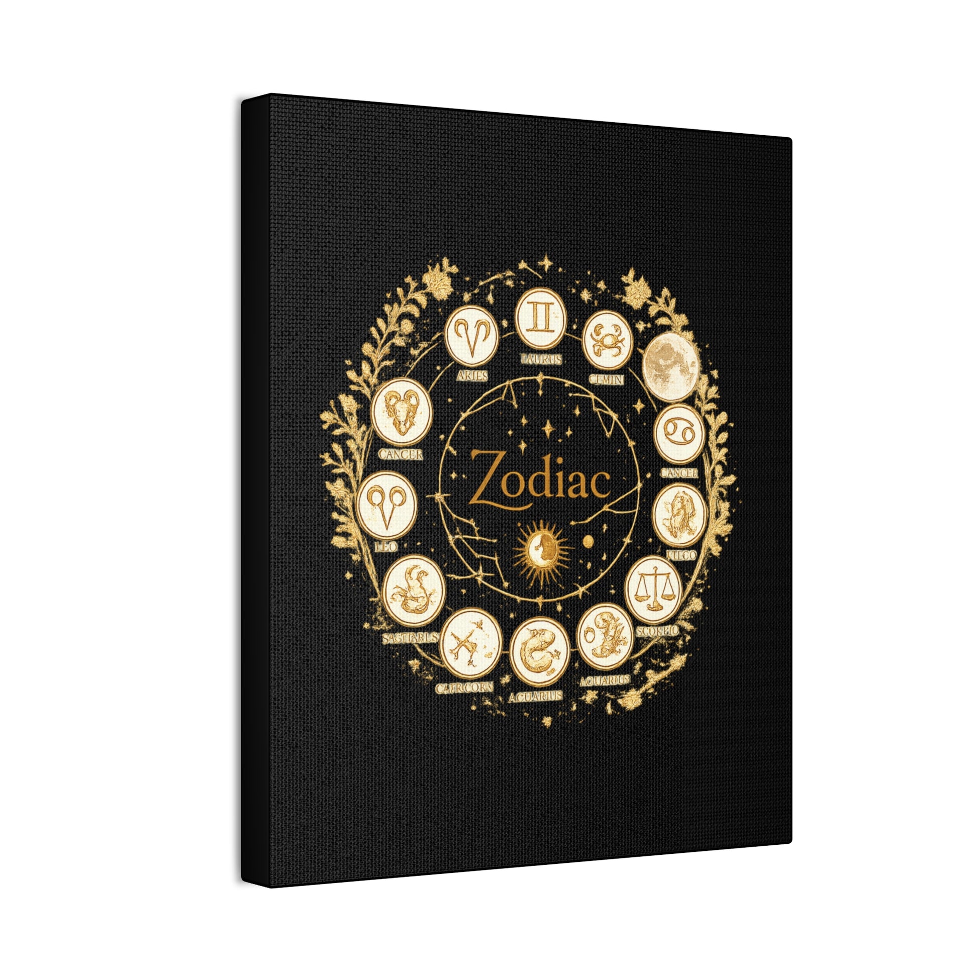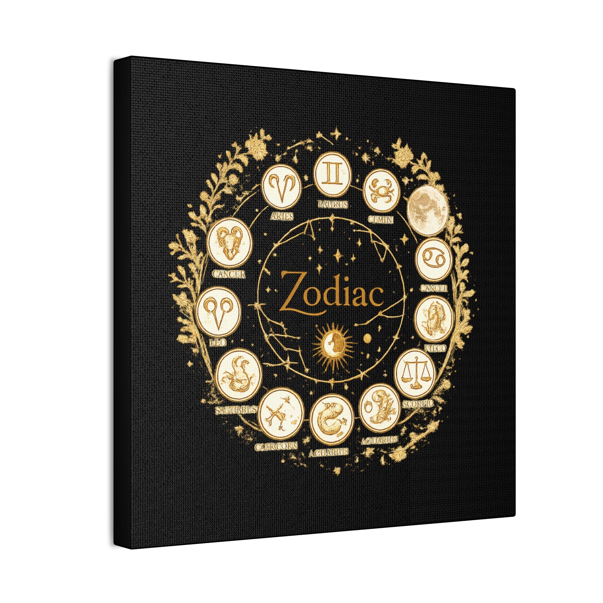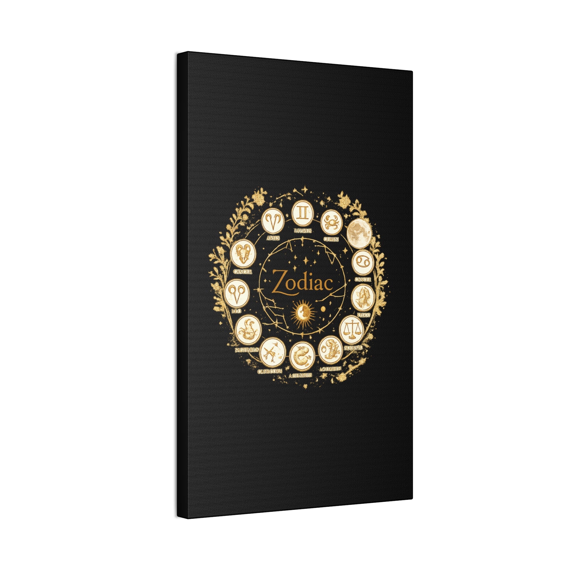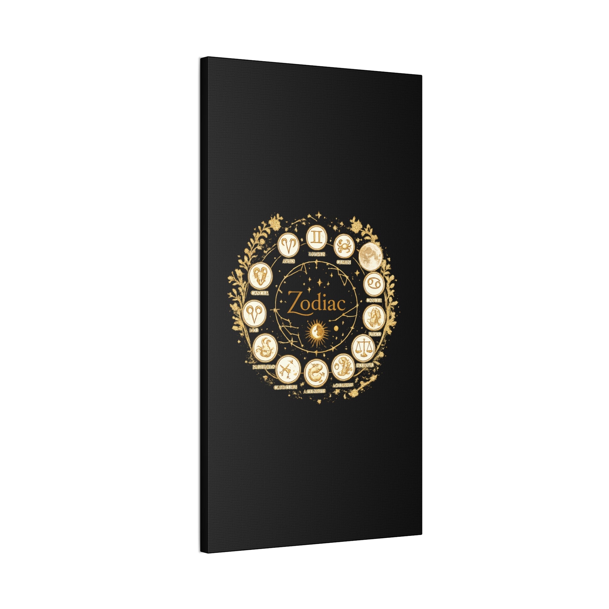 This canvas features a refined zodiac wheel illustrated in luminous gold tones against a deep black background, creating a bold and sophisticated visual contrast. The circular composition highlights all twelve astrological symbols with precise, vintage-inspired detailing, giving the artwork a timeless and meaningful presence. Designed to stand out as a statement piece, it adds both mystery and elegance to modern living spaces.