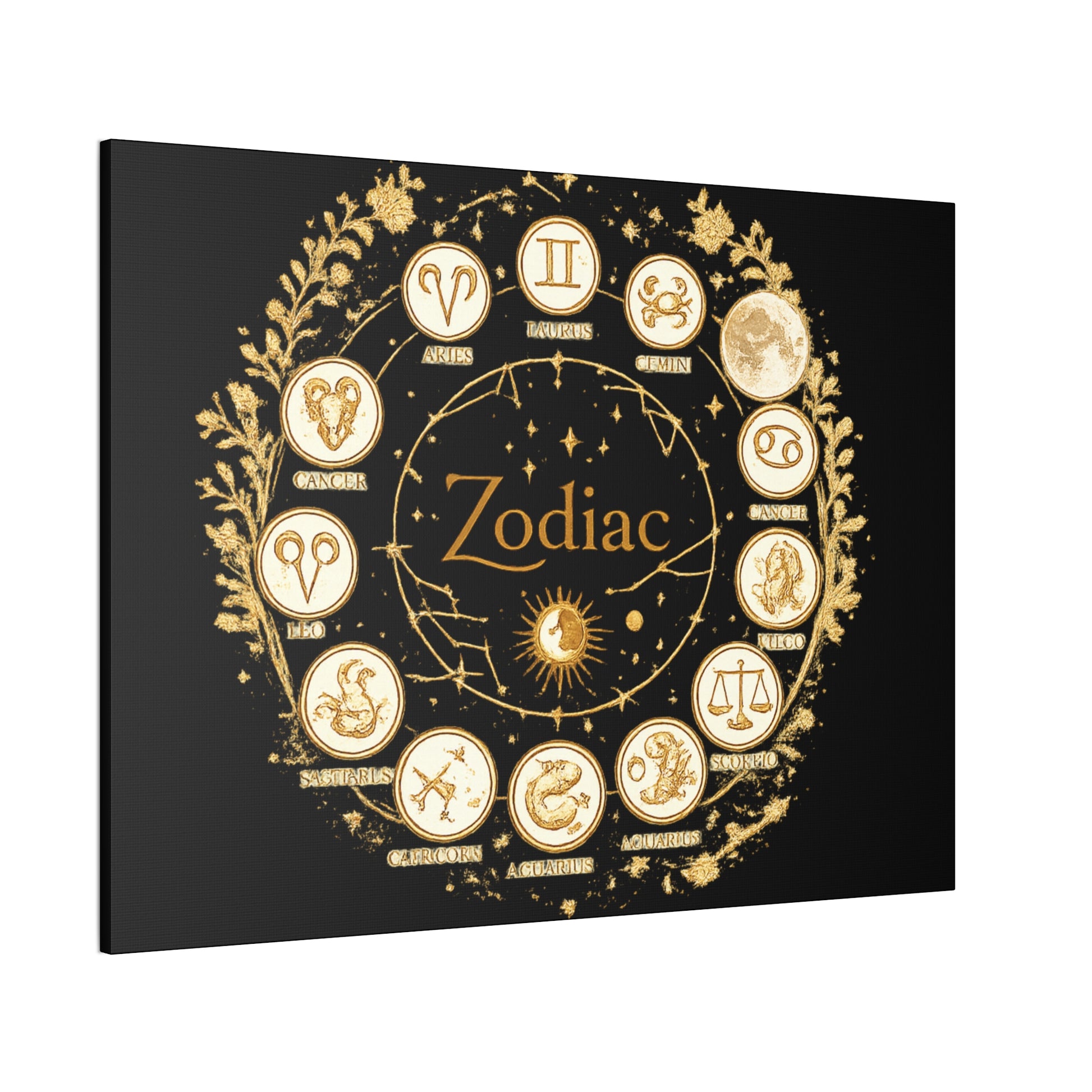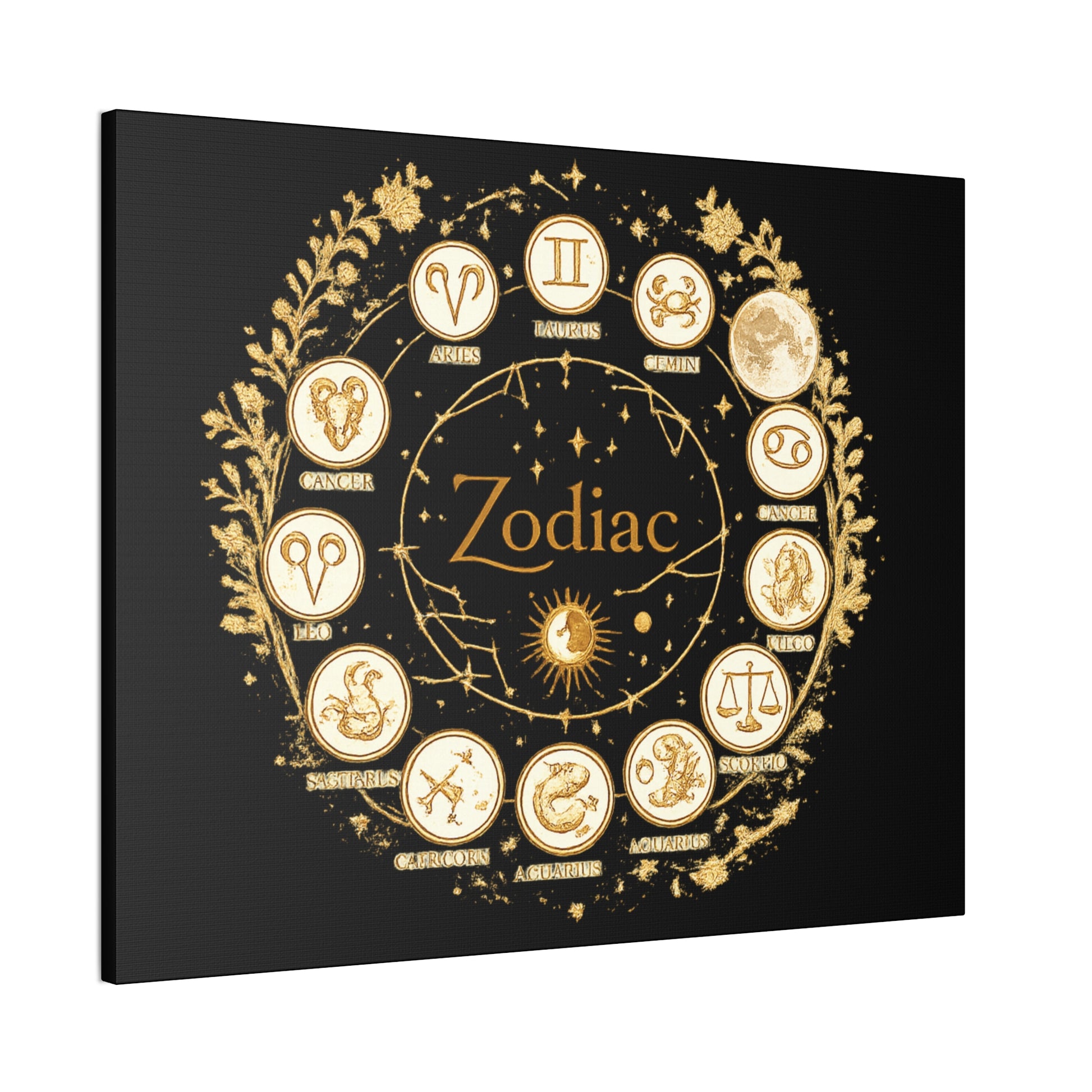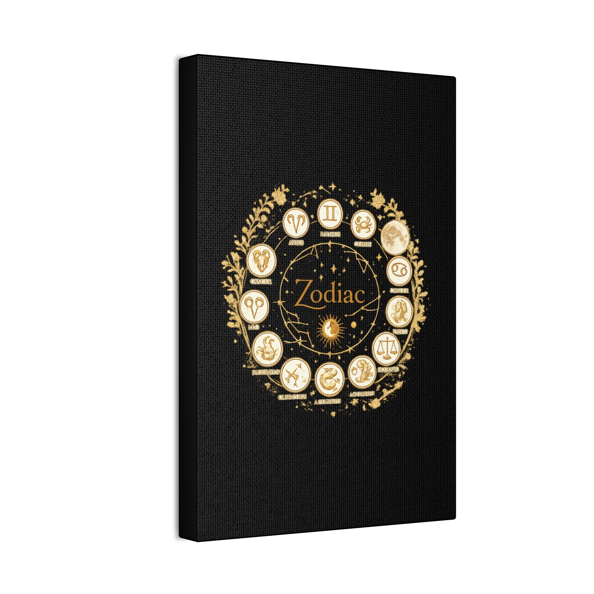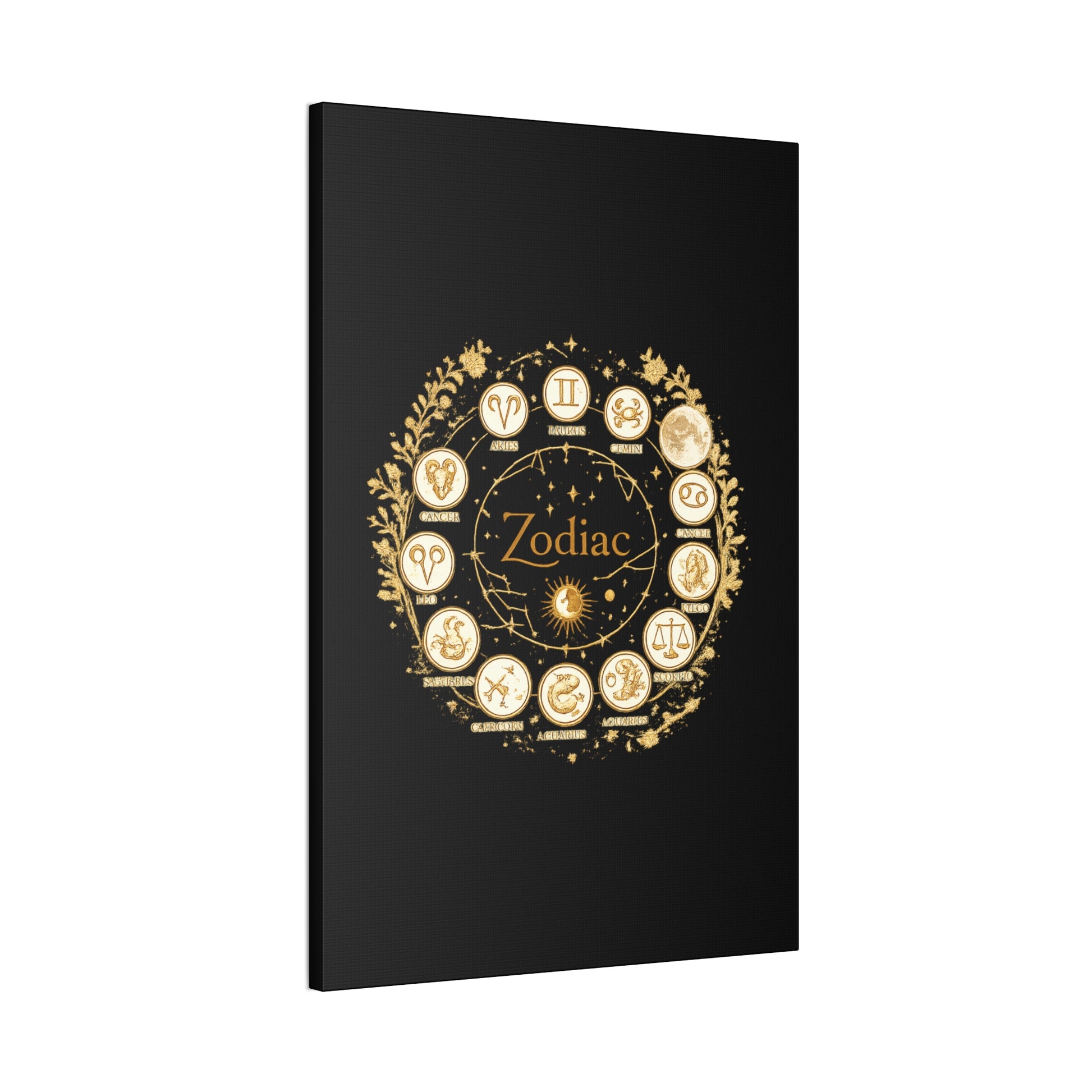 This canvas features a refined zodiac wheel illustrated in luminous gold tones against a deep black background, creating a bold and sophisticated visual contrast. The circular composition highlights all twelve astrological symbols with precise, vintage-inspired detailing, giving the artwork a timeless and meaningful presence. Designed to stand out as a statement piece, it adds both mystery and elegance to modern living spaces.