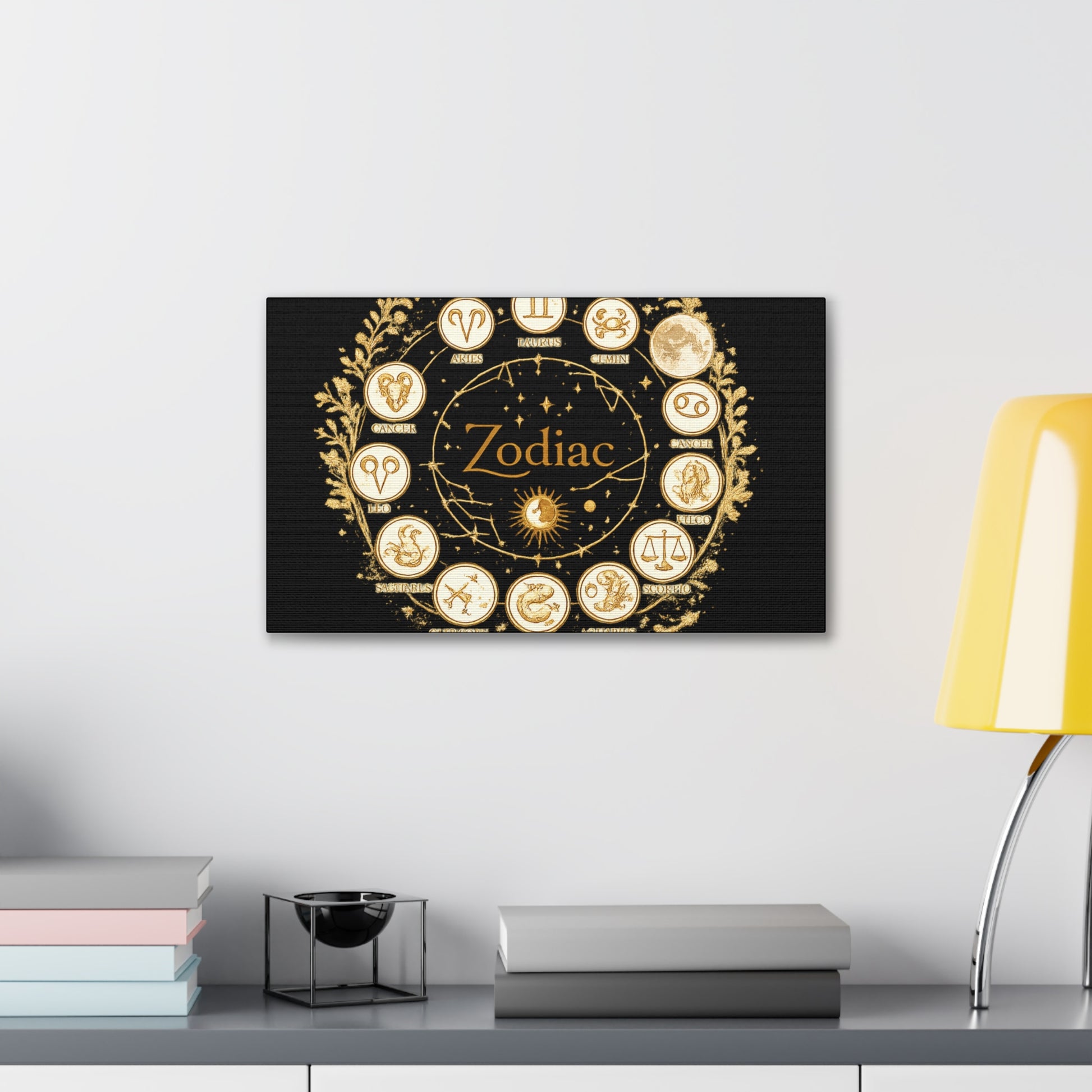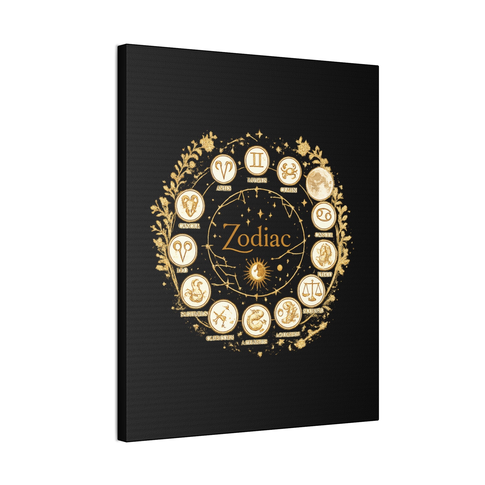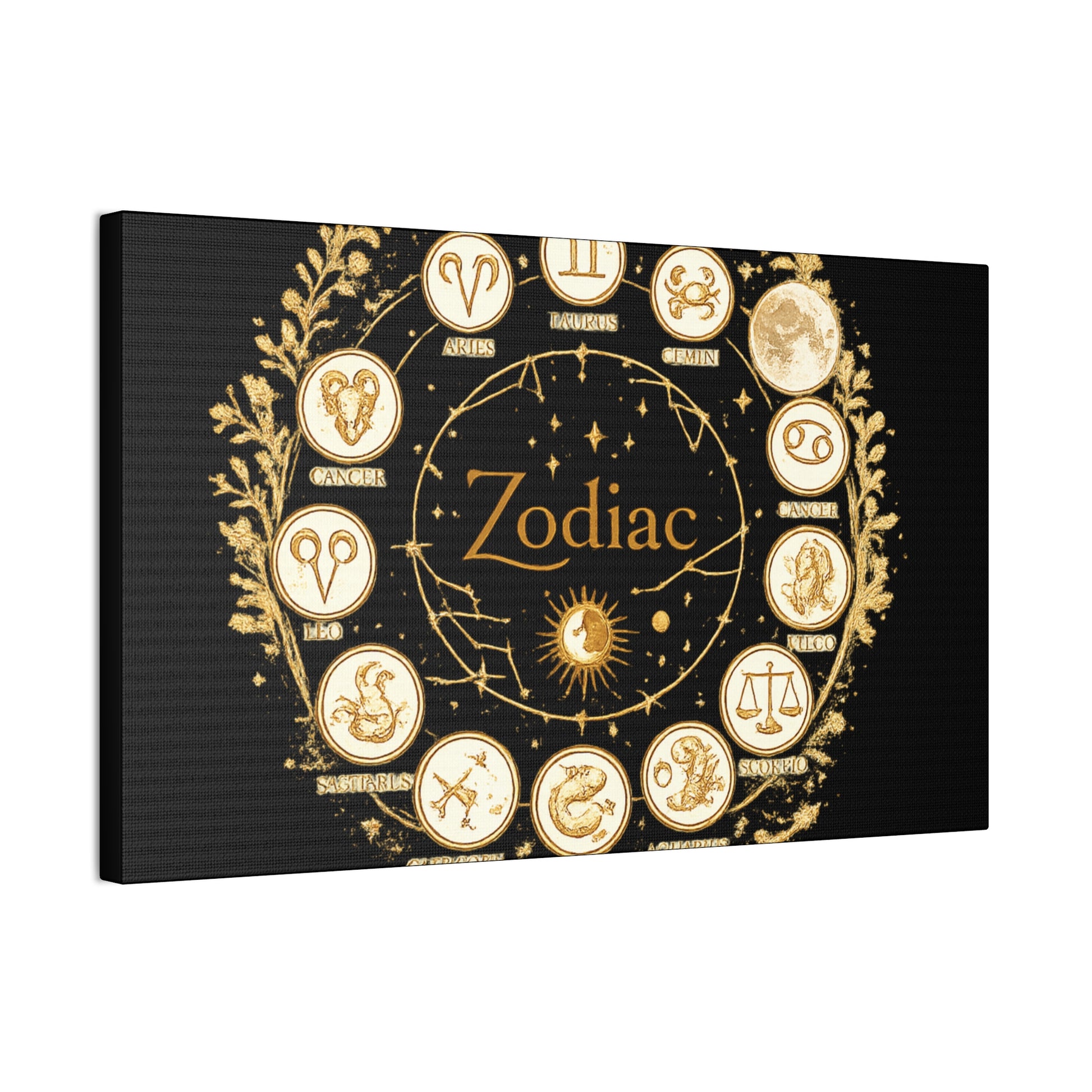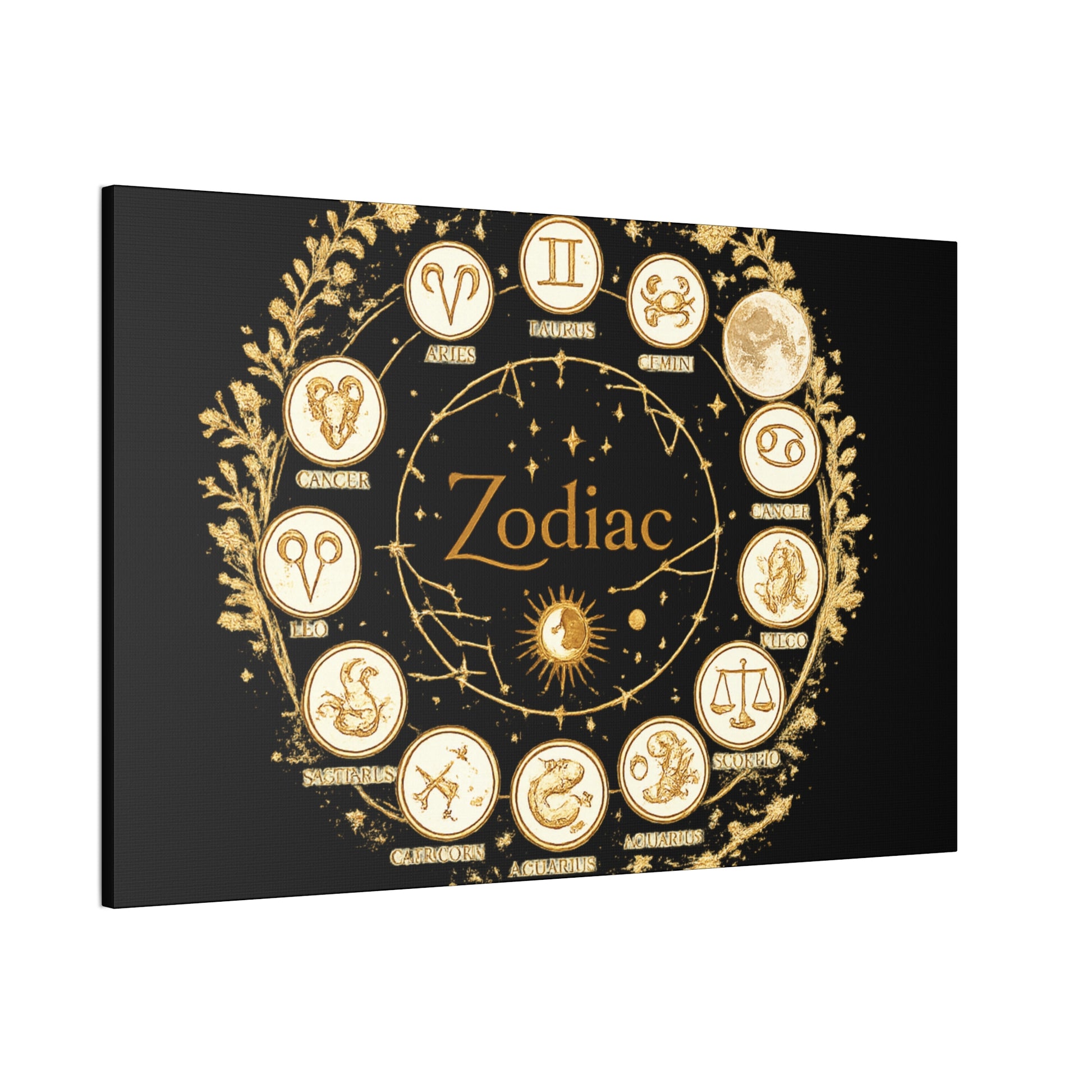 This canvas features a refined zodiac wheel illustrated in luminous gold tones against a deep black background, creating a bold and sophisticated visual contrast. The circular composition highlights all twelve astrological symbols with precise, vintage-inspired detailing, giving the artwork a timeless and meaningful presence. Designed to stand out as a statement piece, it adds both mystery and elegance to modern living spaces.