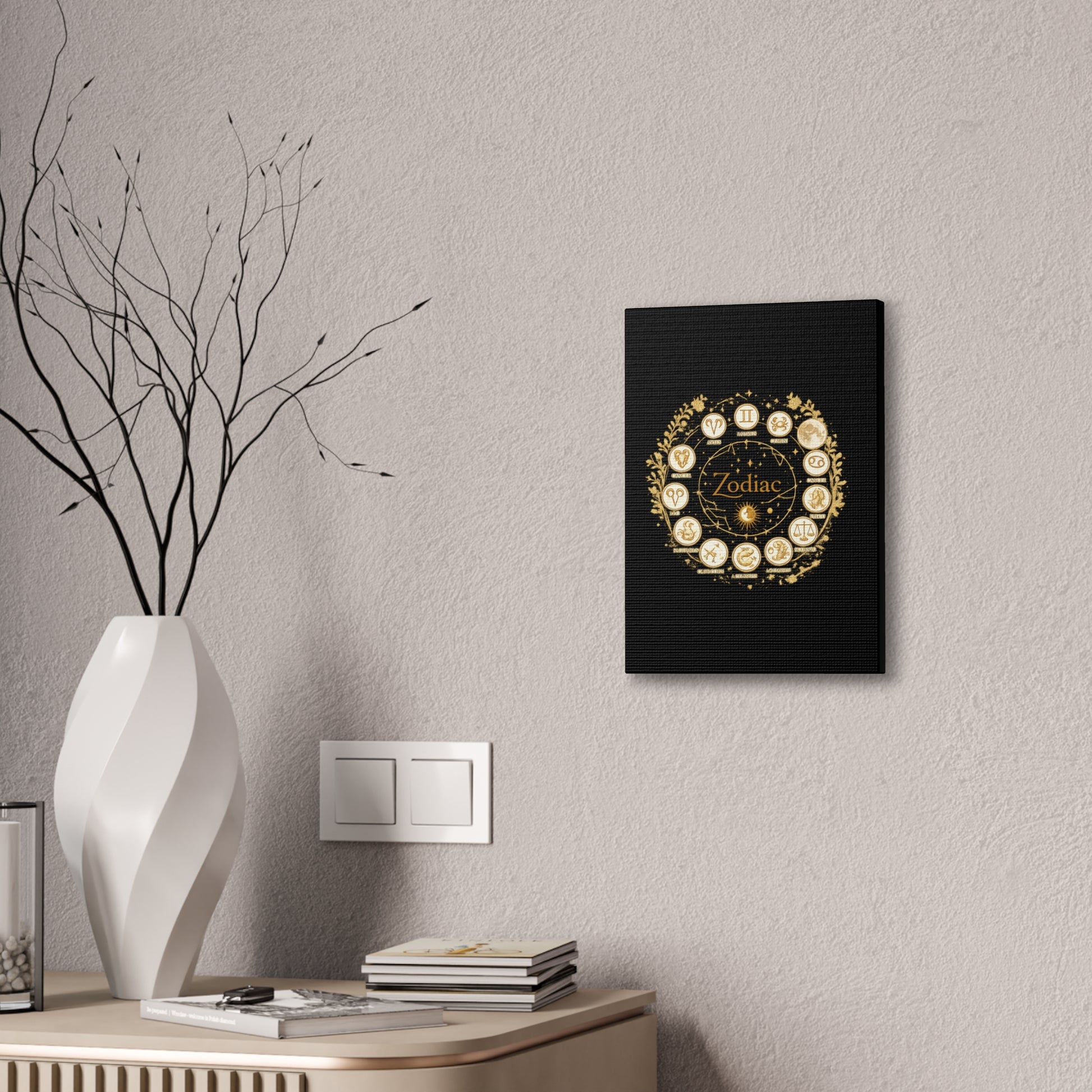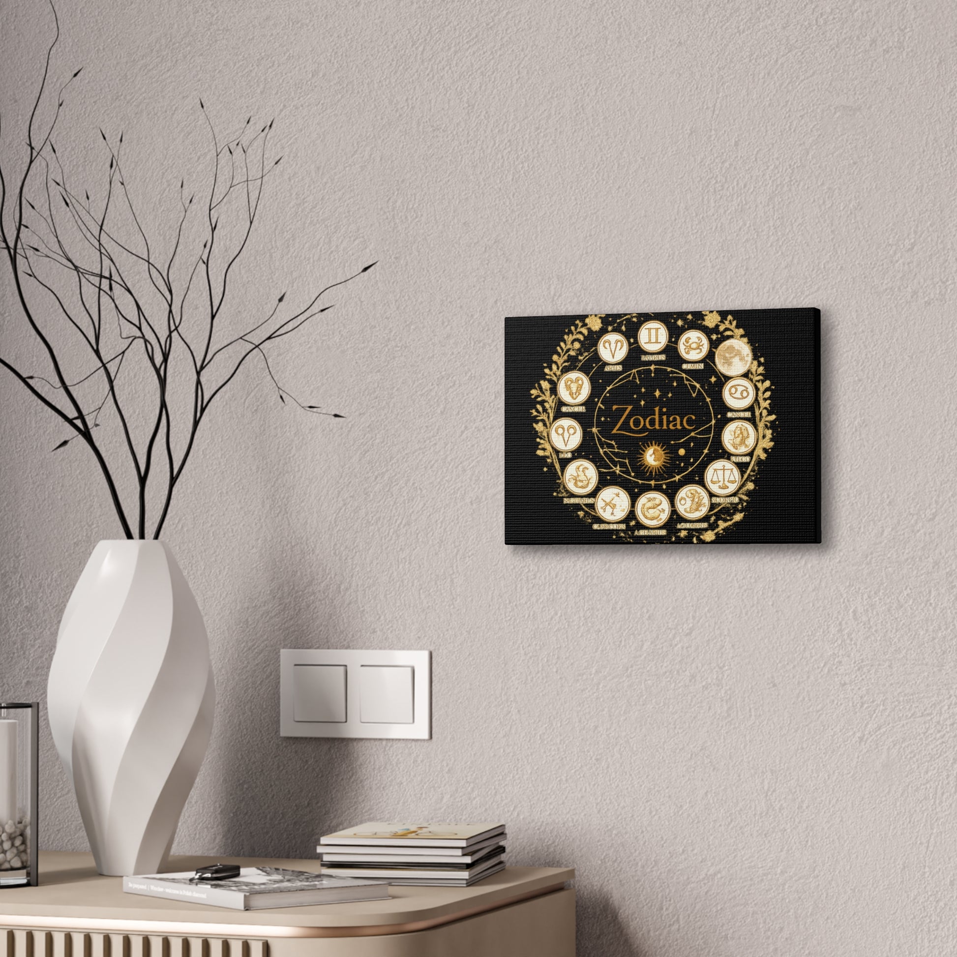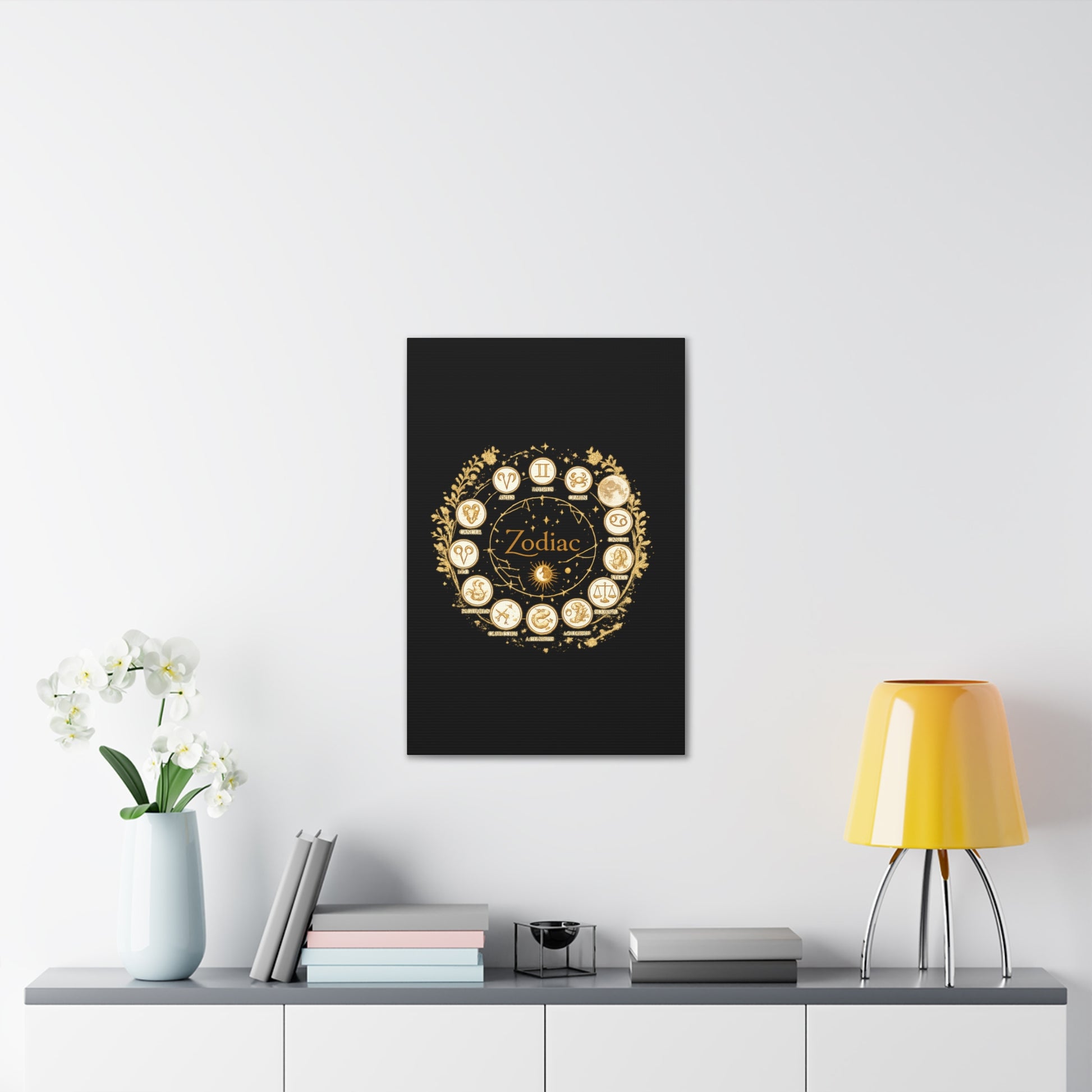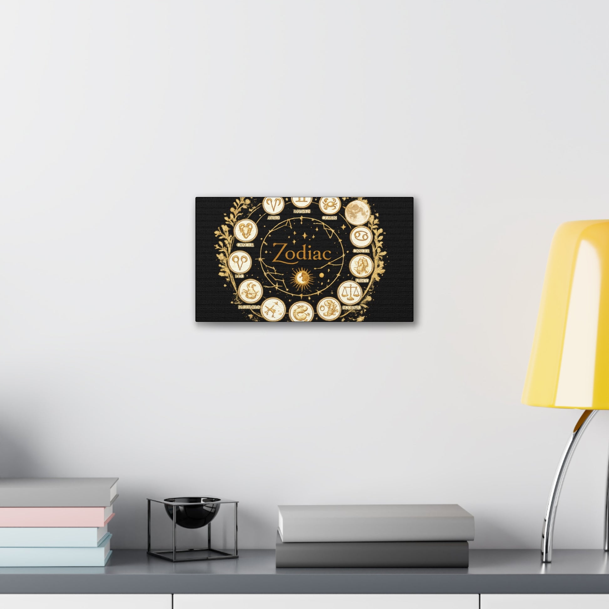 This canvas features a refined zodiac wheel illustrated in luminous gold tones against a deep black background, creating a bold and sophisticated visual contrast. The circular composition highlights all twelve astrological symbols with precise, vintage-inspired detailing, giving the artwork a timeless and meaningful presence. Designed to stand out as a statement piece, it adds both mystery and elegance to modern living spaces.